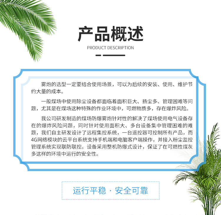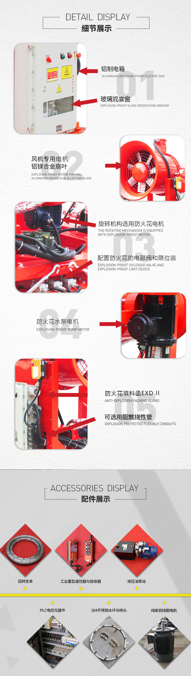 產(chǎn)品特點(diǎn):100米煤場防爆霧炮機(jī)采用立式結(jié)構(gòu),工作穩(wěn)定,并且全部都采用了軟啟動的裝置,讓設(shè)備在工作的時(shí)候能夠正常穩(wěn)定的發(fā)揮,采用1000米遠(yuǎn)程遙控,機(jī)身攜帶大功率信號接收器,可在更遠(yuǎn)的距離對機(jī)器設(shè)置起停,自動供水,自動噴霧,自動旋轉(zhuǎn),自動俯仰,也可采用定時(shí)噴霧,定點(diǎn)噴霧等更智能的操作模式。