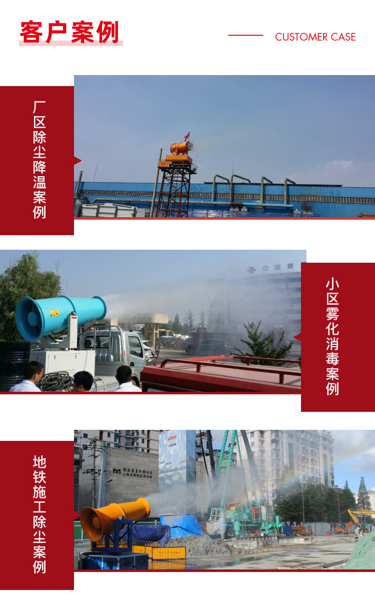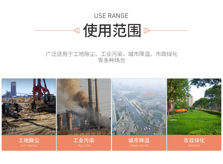 主要用途:用于煤礦場、城市拆遷工地、冶金鋼鐵企業(yè)、采礦區(qū)域、煤化工企業(yè)、水泥廠、火力發(fā)電廠、物料和礦產(chǎn)品露天堆放廠、混凝土處理廠、垃圾堆放場、垃圾焚燒廠、沙廠、干式物料倉庫、露天爆破、重度粉塵區(qū)域。