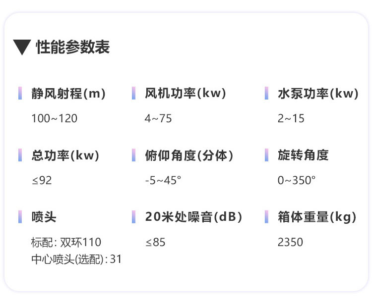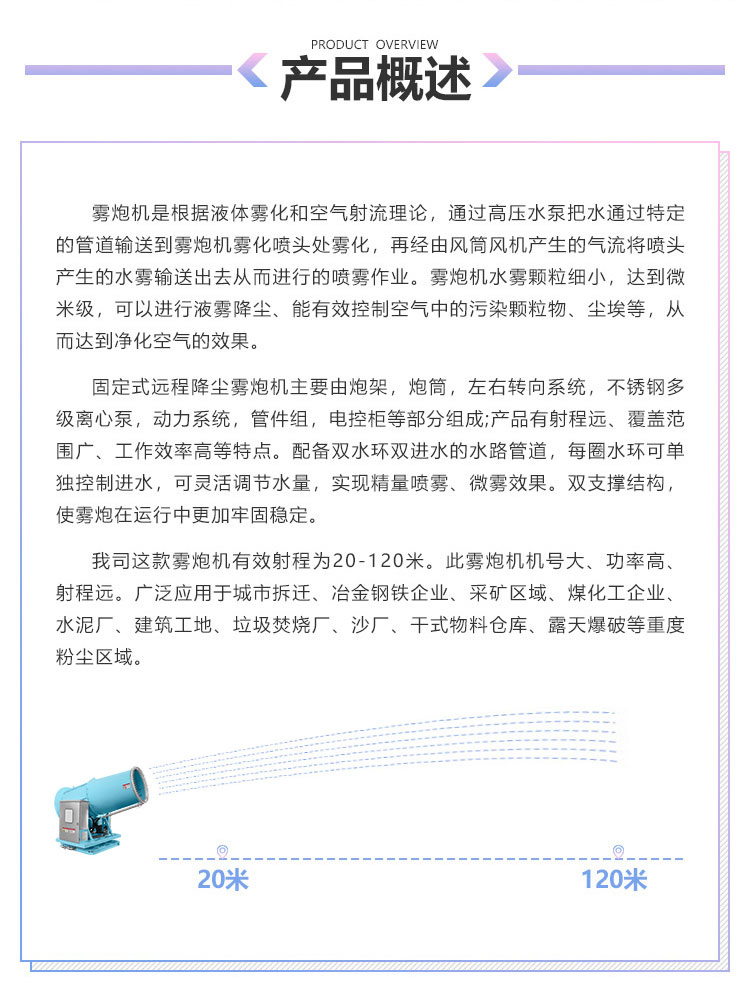 產(chǎn)品特點(diǎn):120米固定式遠(yuǎn)程霧炮機(jī)射程遠(yuǎn)、覆蓋范圍廣、工作效率高、可以實(shí)現(xiàn)精量噴霧;配套動(dòng)力靈活、智能操控、防凍防堵。