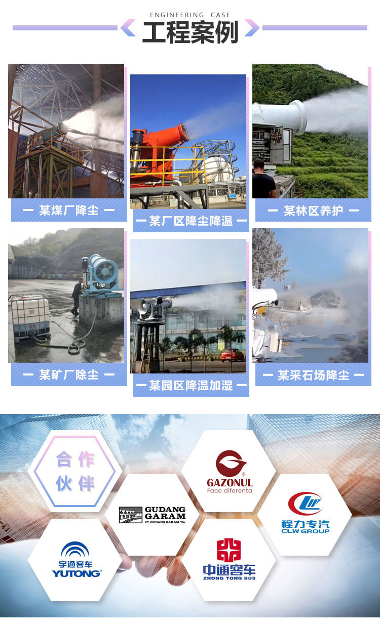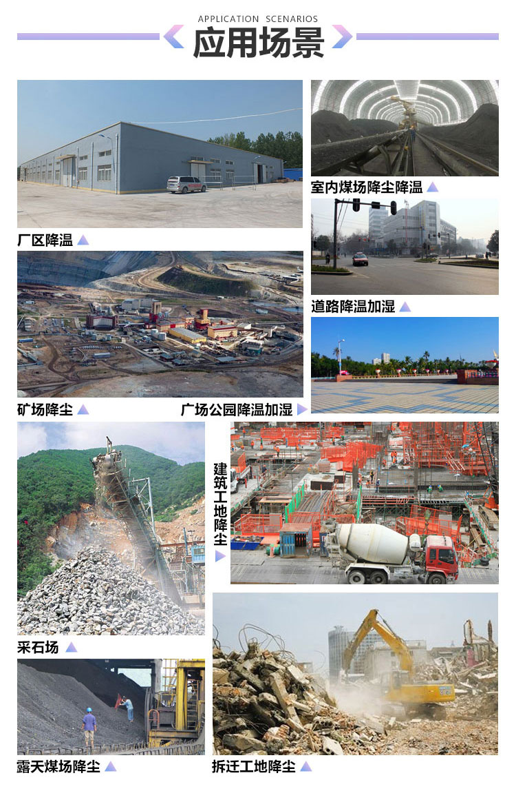 主要用途:用于煤礦場、城市拆遷工地、冶金鋼鐵企業(yè)、采礦區(qū)域、煤化工企業(yè)、水泥廠、火力發(fā)電廠、物料和礦產(chǎn)品露天堆放廠、混凝土處理廠、垃圾堆放場、垃圾焚燒廠、沙廠、干式物料倉庫、露天爆破、重度粉塵區(qū)域。