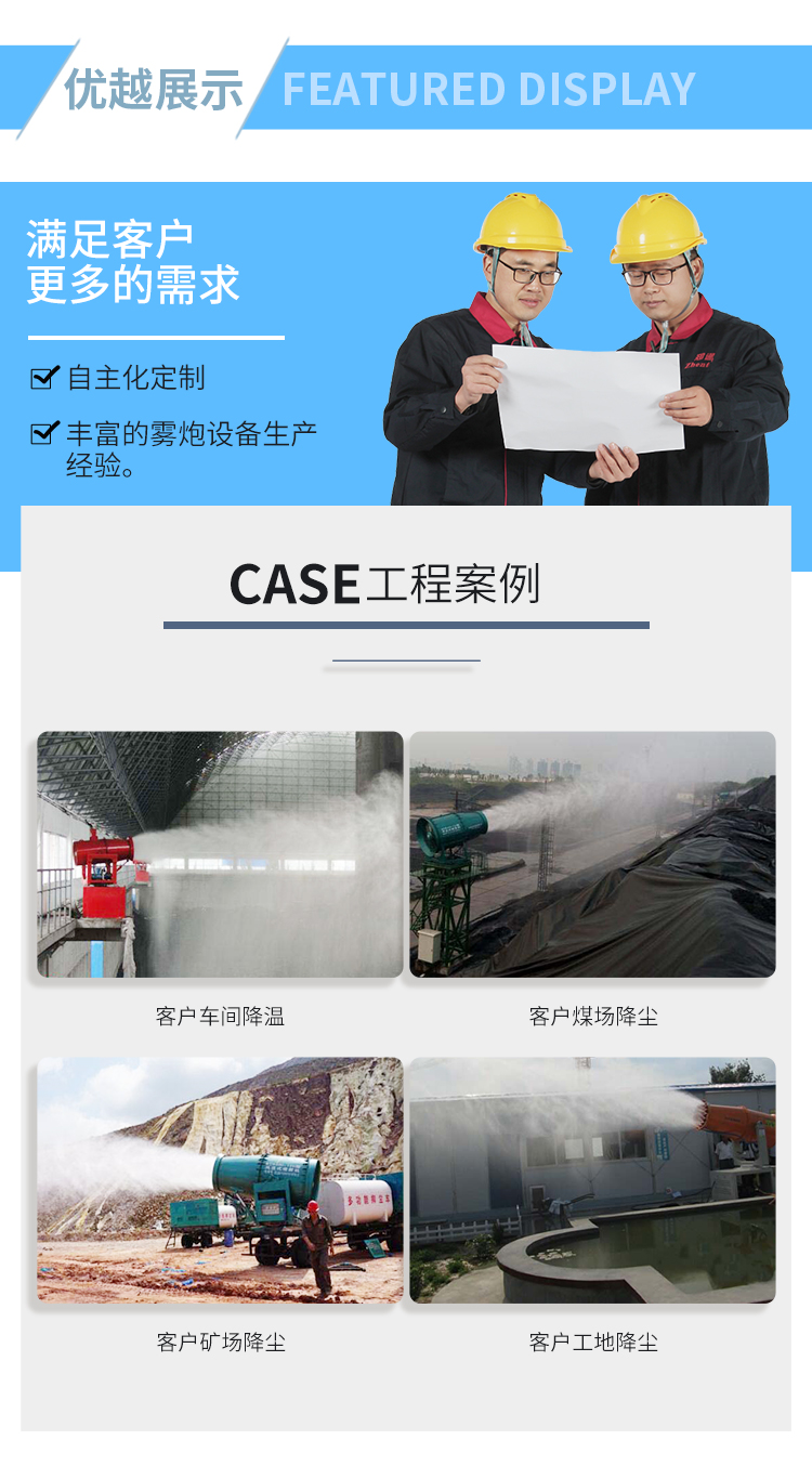 主要用途:適用于城市拆遷工地、冶金鋼鐵企業、采礦區域、煤化工企業、水泥廠、火力發電廠、建筑工地、物料和礦產品露天堆放廠、混凝土處理廠、垃圾堆放場、垃圾焚燒廠、沙廠、干式物料倉庫、露天爆破、重度粉塵區域。