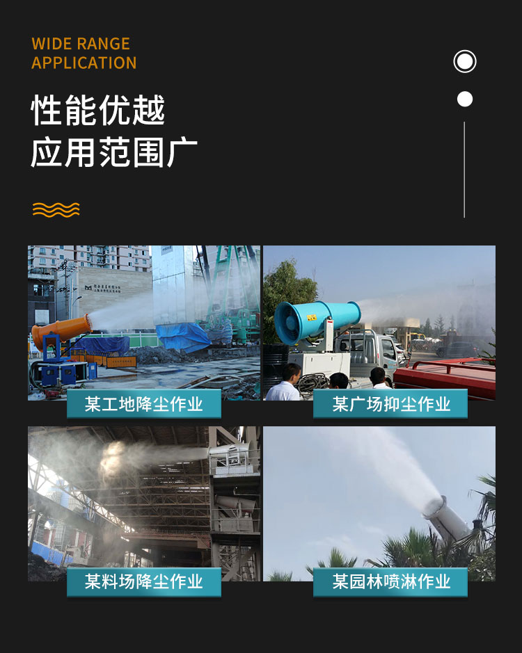主要用途:用于煤礦場、城市拆遷工地、冶金鋼鐵企業(yè)、采礦區(qū)域、煤化工企業(yè)、水泥廠、火力發(fā)電廠、物料和礦產品露天堆放廠、混凝土處理廠、垃圾堆放場、垃圾焚燒廠、沙廠、干式物料倉庫、露天爆破、重度粉塵區(qū)域。