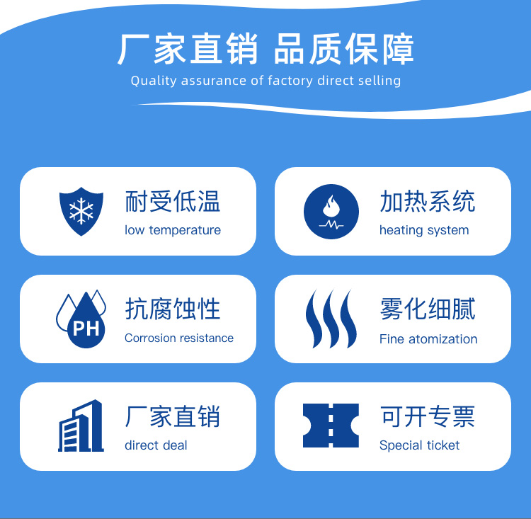 產(chǎn)品特點:化工廠不銹鋼防腐射霧器使用不銹鋼板材替換了普通碳鋼板材。從而使得設備天然的具有耐銹,耐腐蝕能力;其它部件可噴涂環(huán)氧樹脂防腐涂層進一步提升抗氧化能力。