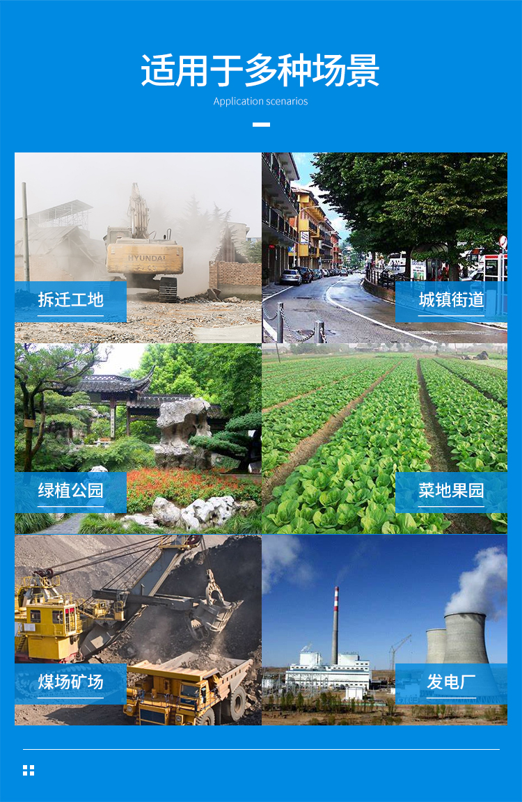 主要用途:用于城市拆遷工地、冶金鋼鐵企業(yè)、采礦區(qū)域、煤化工企業(yè)、水泥廠、火力發(fā)電廠、建筑工地、物料和礦產(chǎn)品露天堆放廠、混凝土處理廠、垃圾堆放場、垃圾焚燒廠、沙廠、干式物料倉庫、露天爆破、重度粉塵區(qū)域。