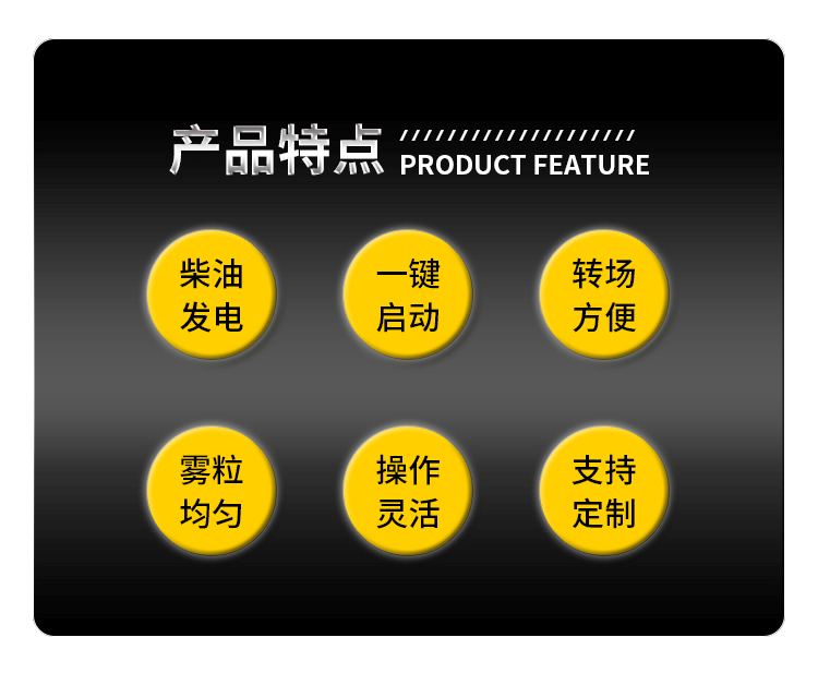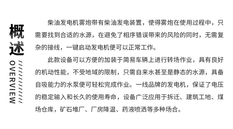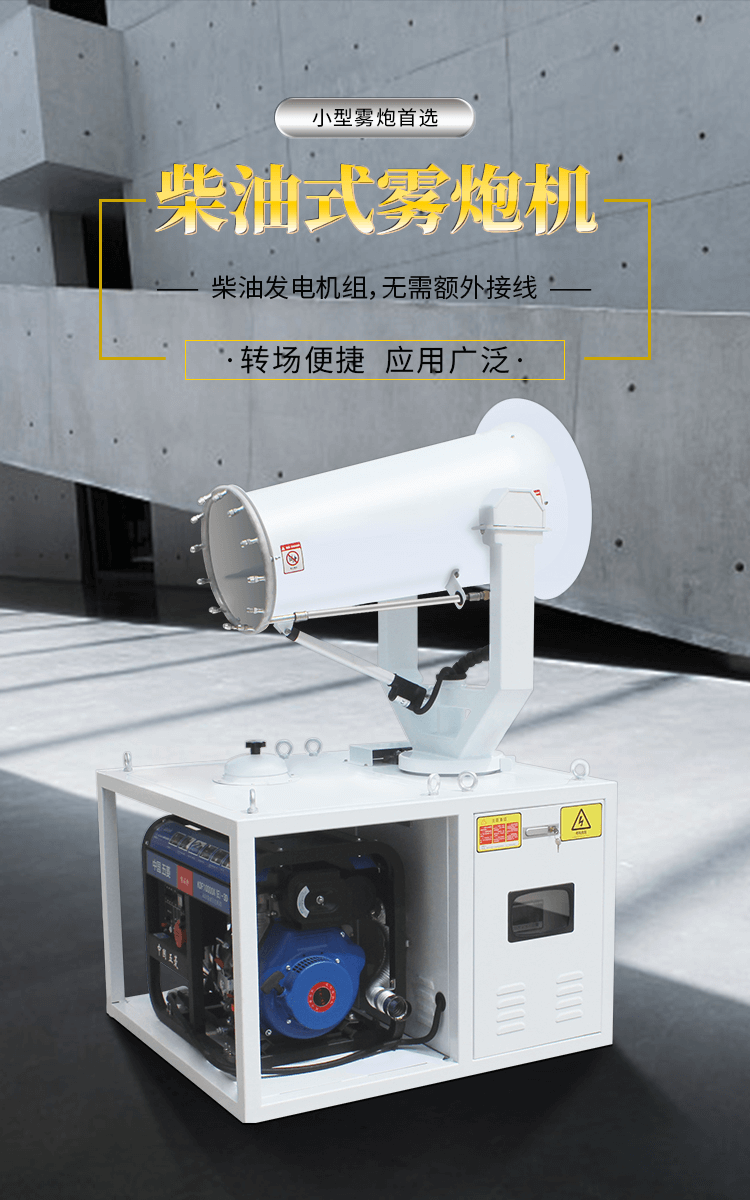 產品特點:柴油式霧炮機可以方便的加裝于簡易車輛上進行轉場作業,具有良好的機動性能,不受地域的限制,只需自來水甚至是靜態的水源,具備自吸能力的水泵便可輕松完成作業。