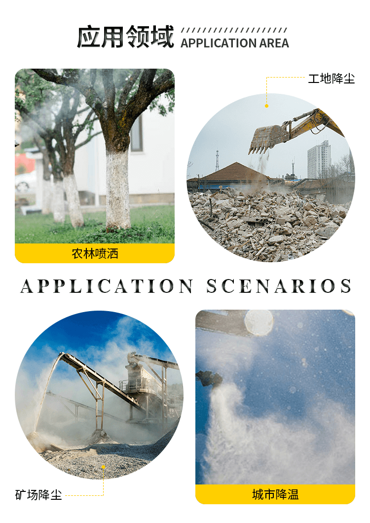 主要用途:建筑工地 煤場,礦場、料場、碼頭工業除塵,農業,園林綠化等飛機場、高速公路、車站、碼頭、公共場所、運動場地、炎熱場地等降塵保濕降溫消毒。