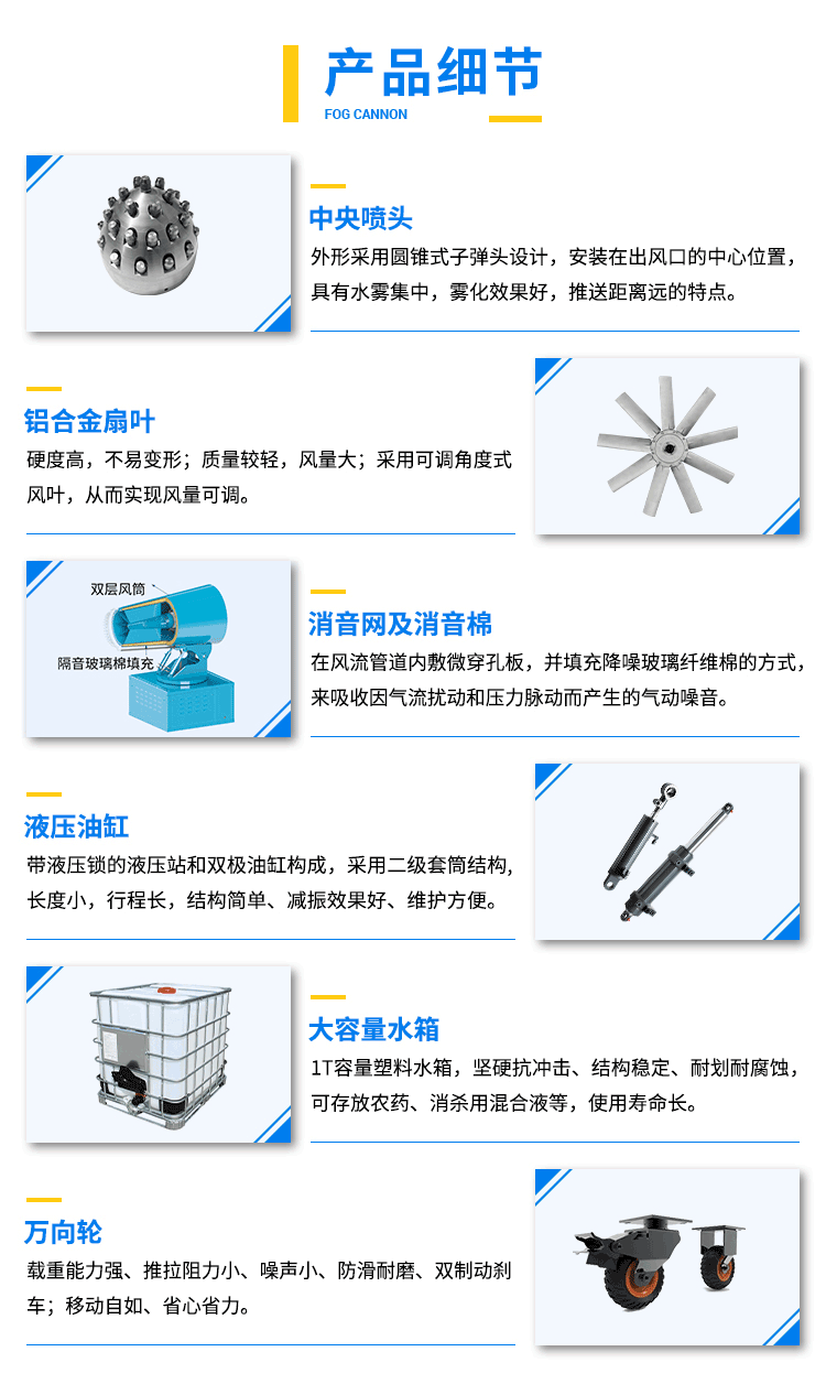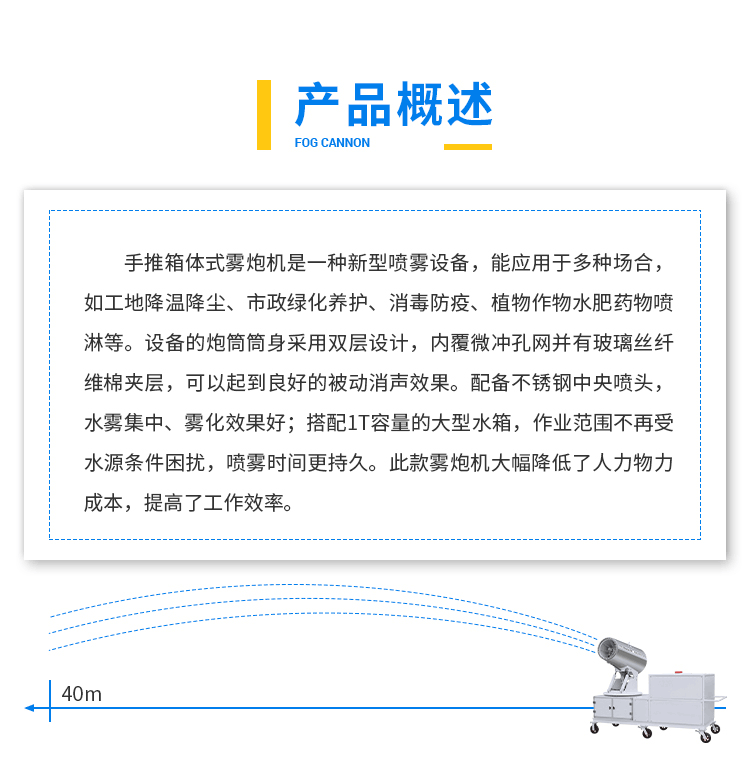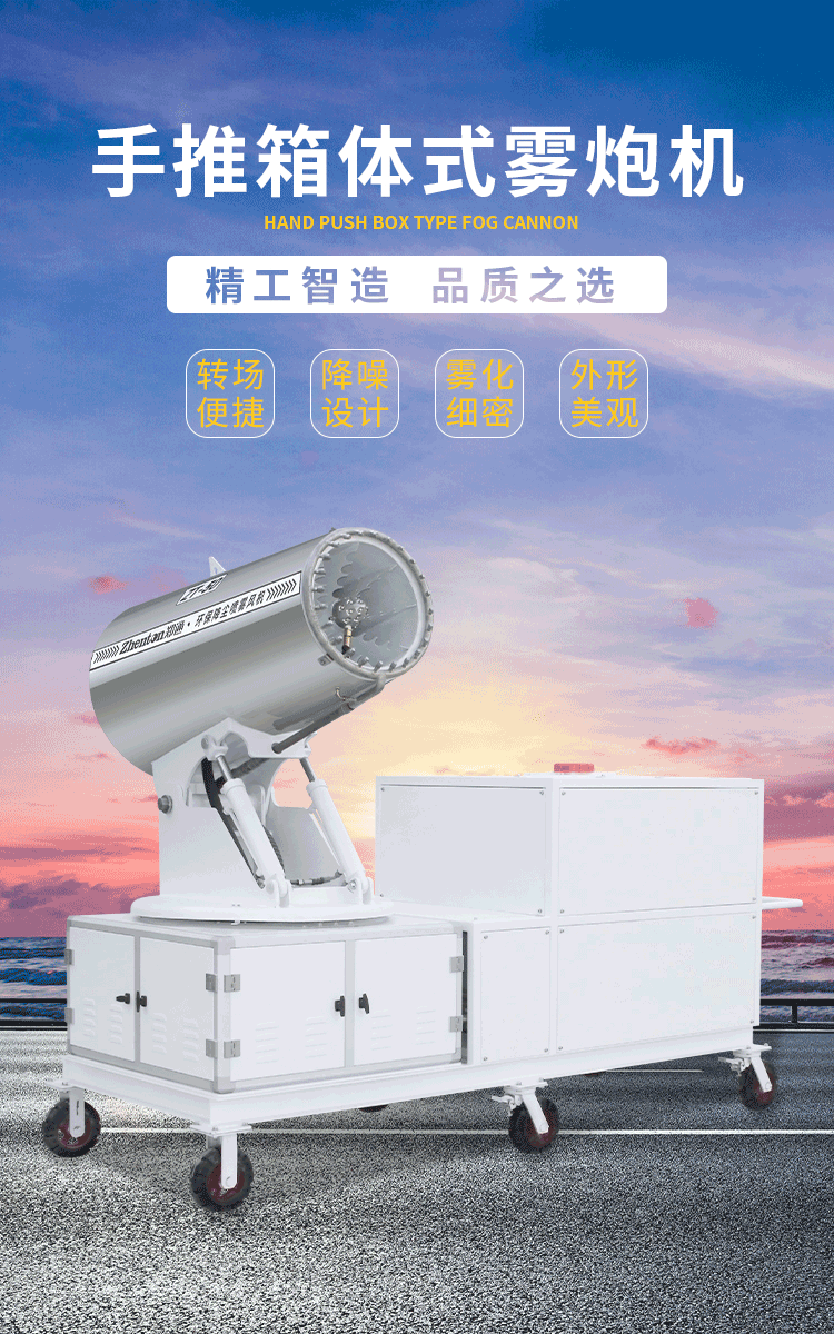 產品特點:手推箱體式霧炮機配備不銹鋼中央噴頭,水霧集中、霧化效果好;搭配1T容量的大型水箱,作業范圍不再受水源條件困擾,噴霧時間更持久。