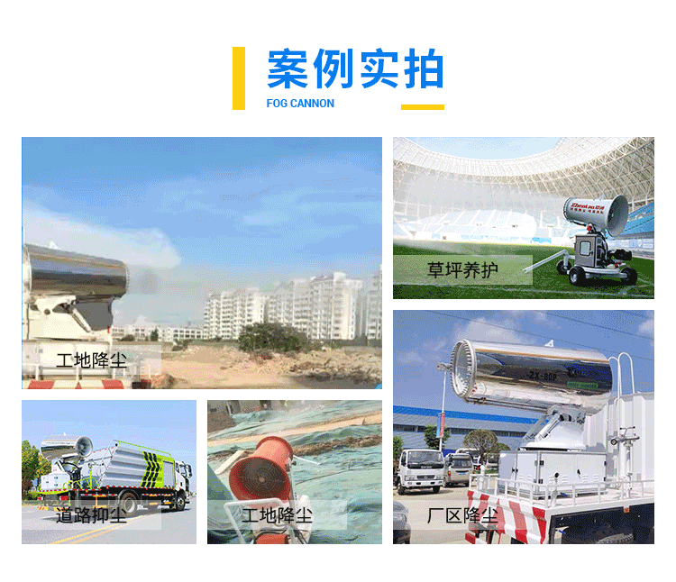 主要用途:建筑垃圾或廢渣廢料機械作業局部揚塵治理、重型車運輸中道路揚塵污染治理;飛機場、高速公路、車站、碼頭、公共場所、運動場地、炎熱場地等降塵保濕降溫消毒。