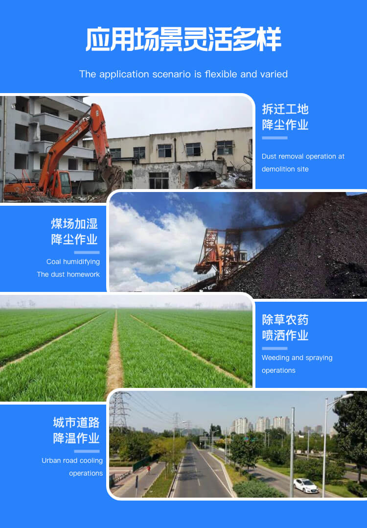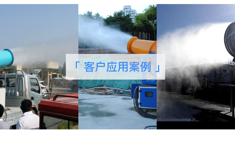 主要用途:建筑工地、冶金鋼鐵企業、采礦區域、煤化工企業、水泥廠、火力發電廠、建筑工地、物料和礦產品露天堆放廠、混凝土處理廠、垃圾堆放場、垃圾焚燒廠、沙廠、干式物料倉庫、露天爆破、重度粉塵區域。