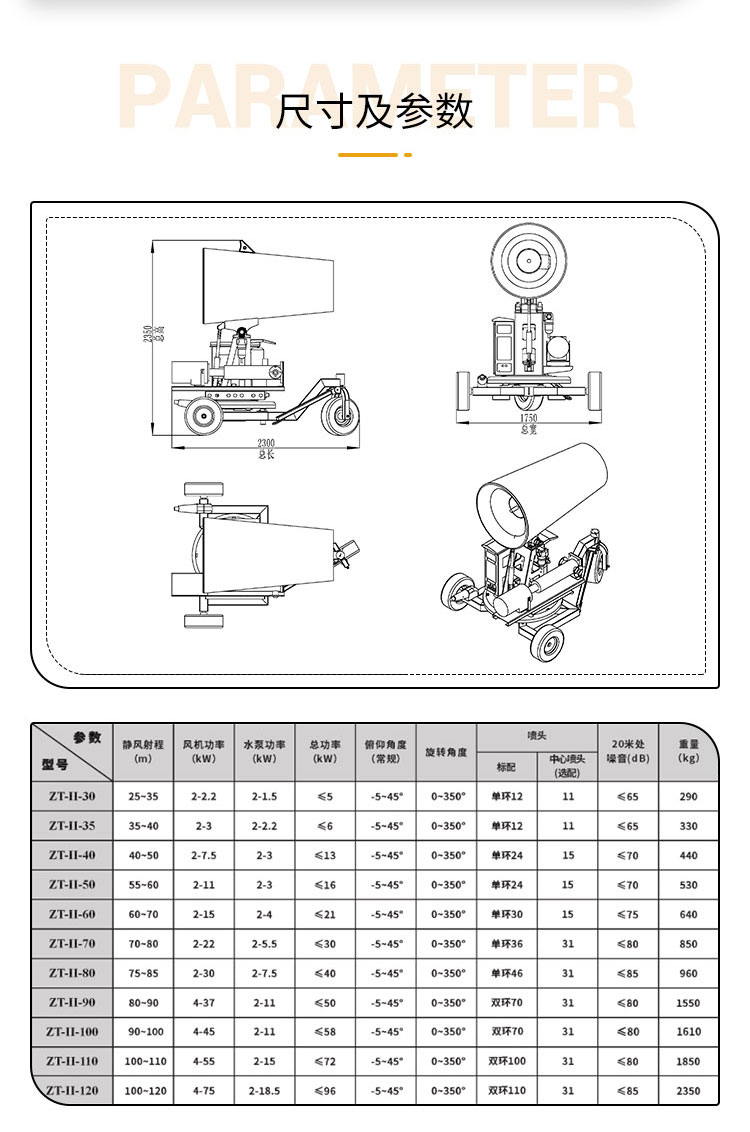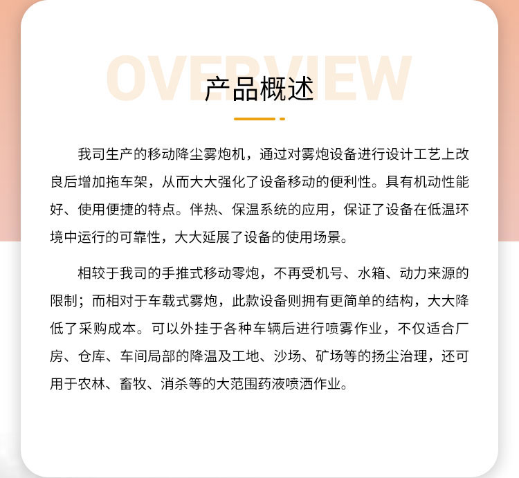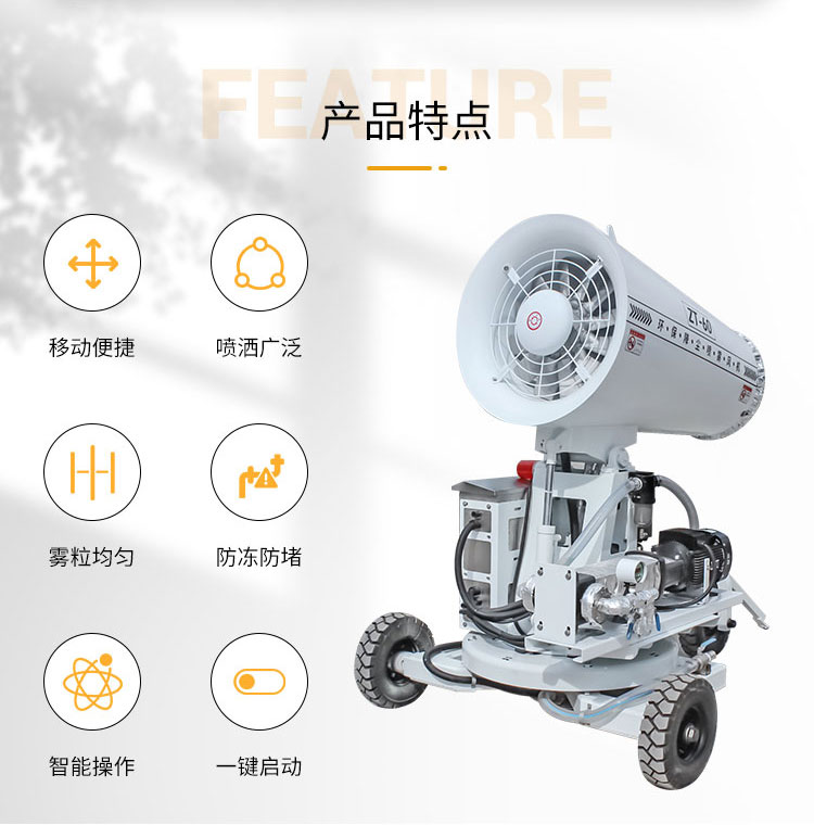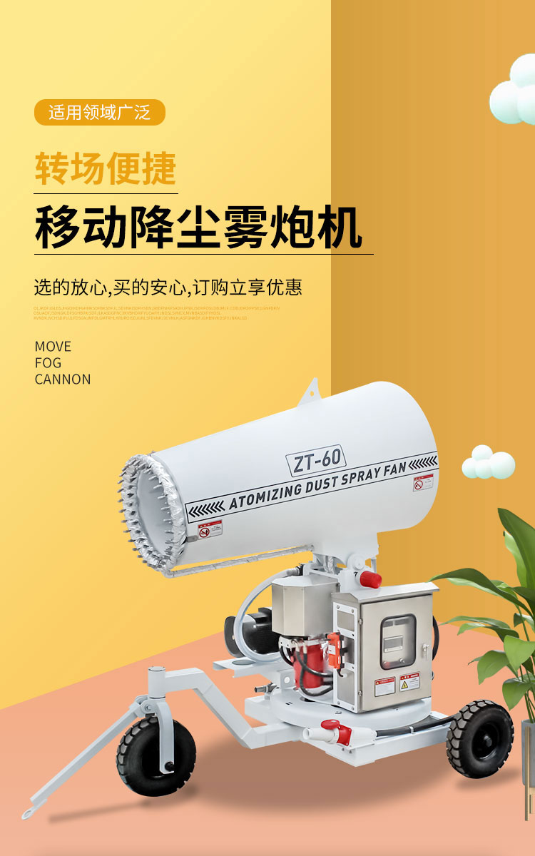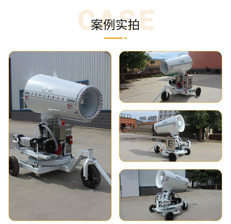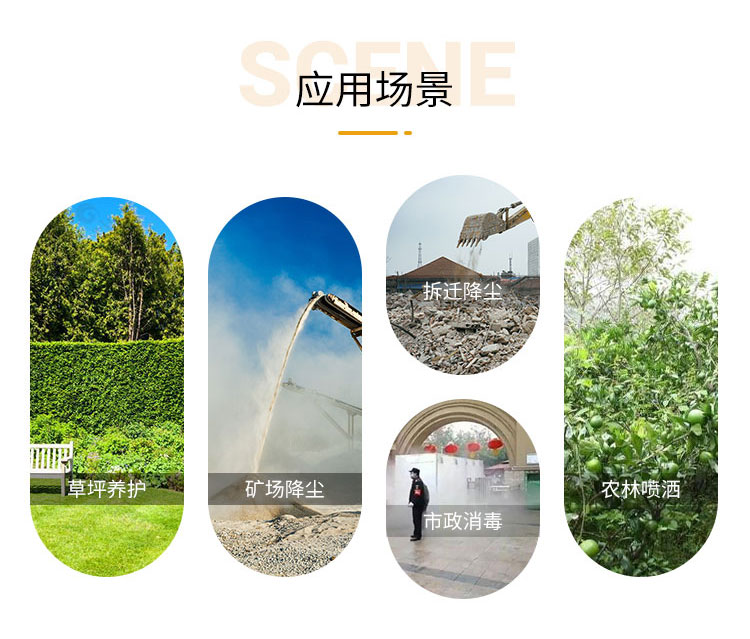 主要用途:建筑工地、煤場、電廠、焦化廠、鋼廠、工業(yè)除塵抑塵等;農(nóng)業(yè),園林綠化、飛機場、高速公路、車站、碼頭、公共場所、運動場地、炎熱場地等防疫消毒保濕降溫。