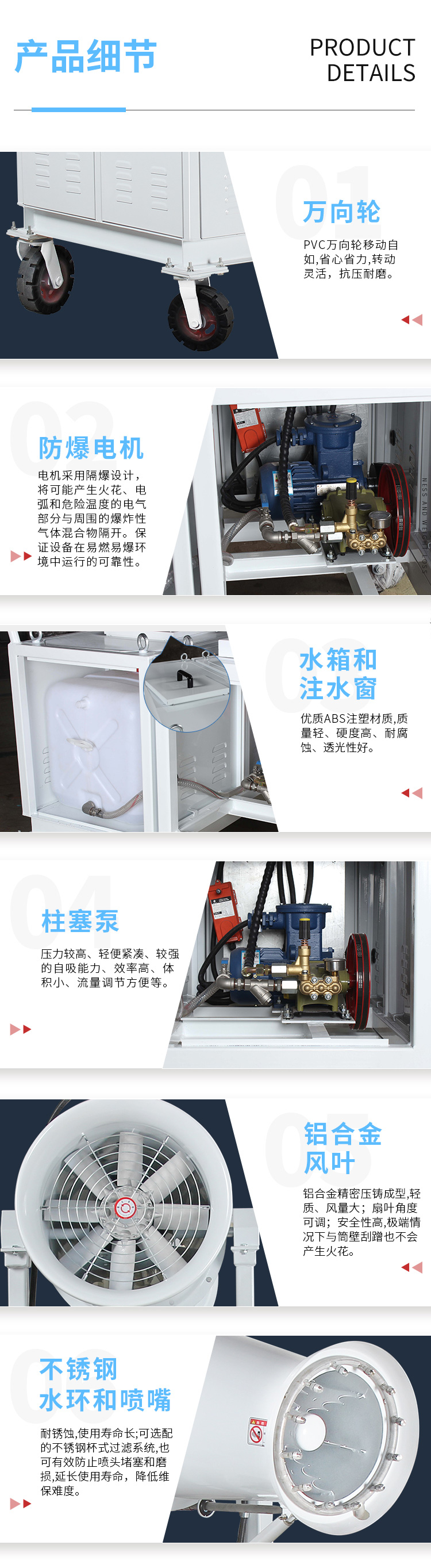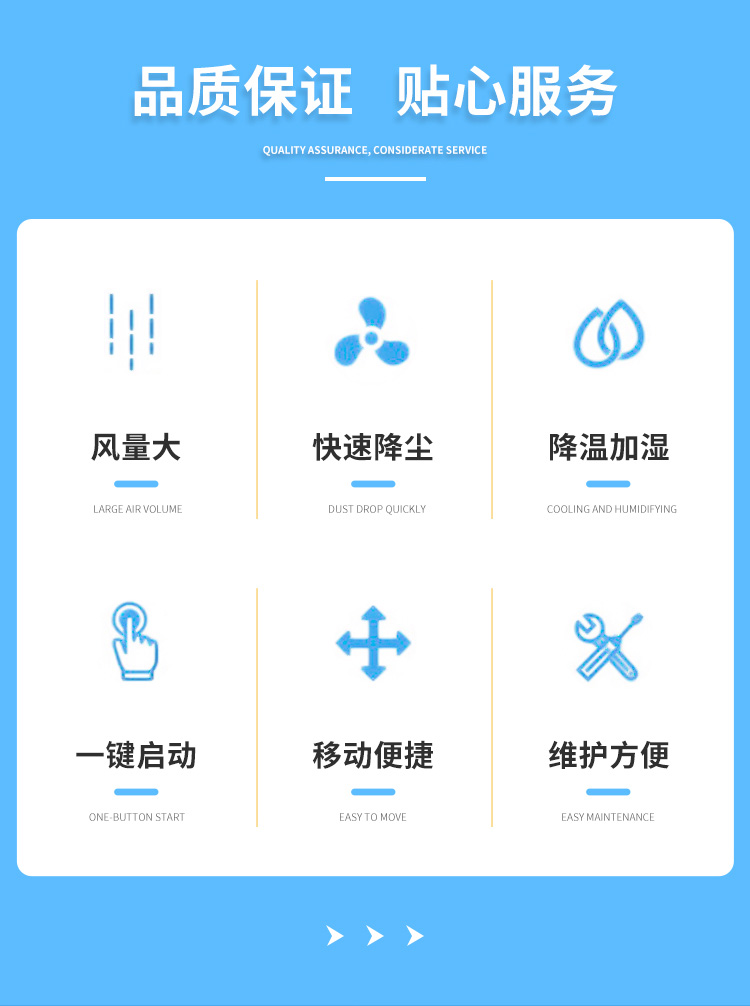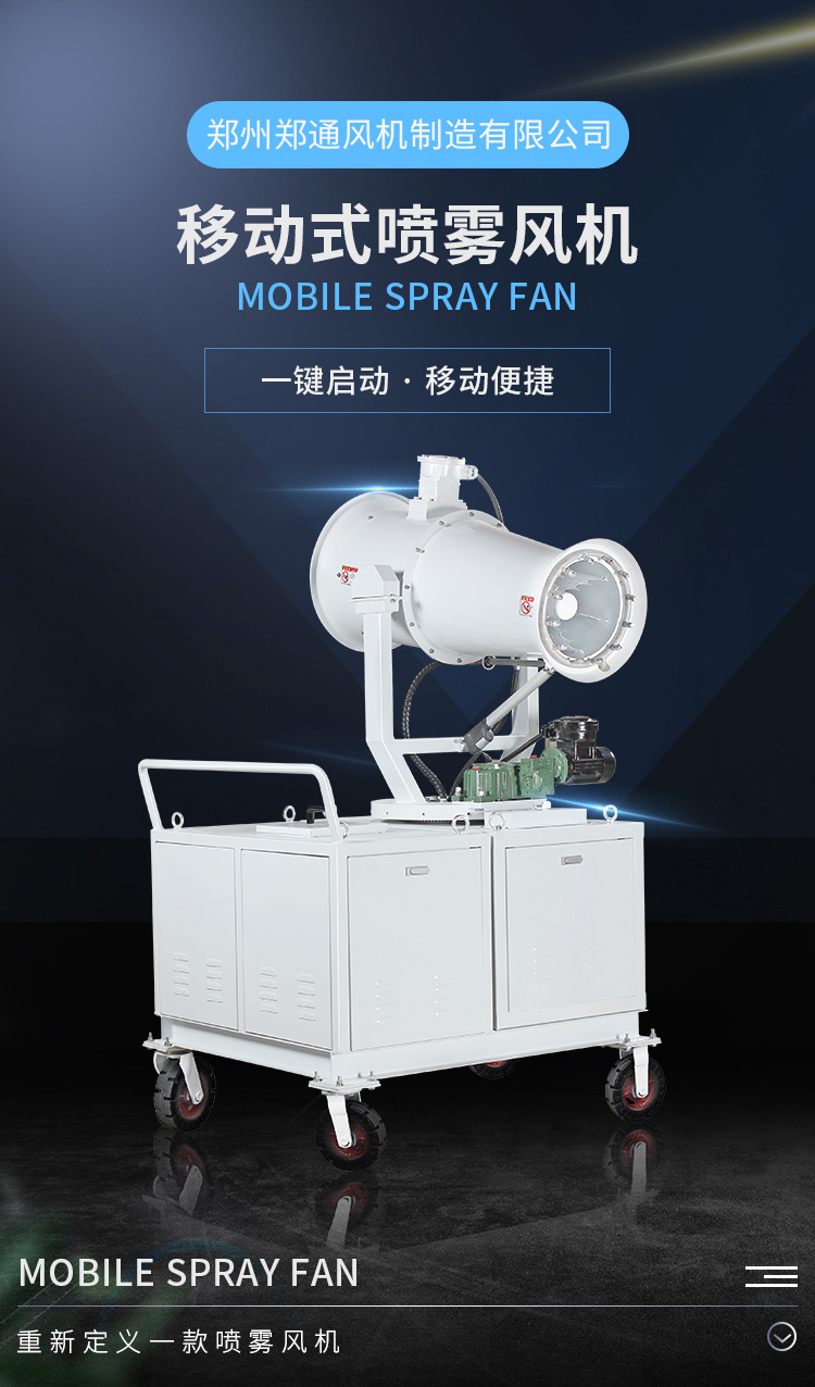 產(chǎn)品特點:移動式噴霧風(fēng)機這款產(chǎn)品具有一鍵啟動功能,能起到快速降塵、降溫的作用;移動便捷,方便維修。