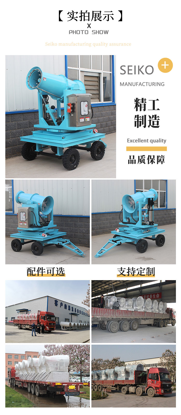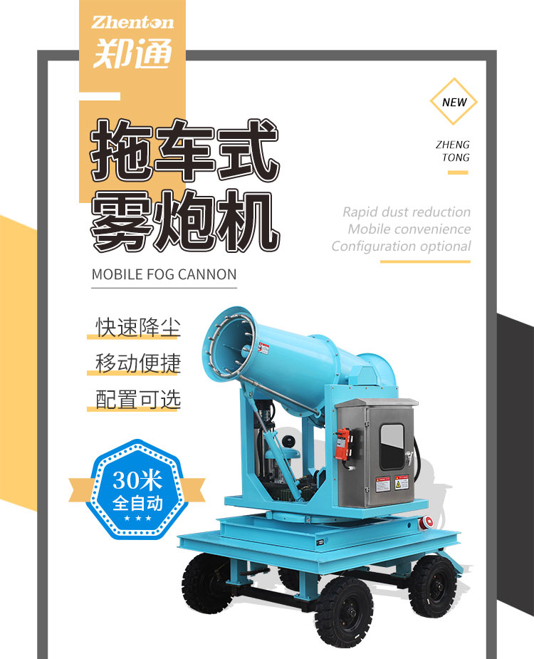 產品特點:拖車式霧炮機采用四輪牽引設計,移動便捷、射程遠、覆蓋范圍廣,可在多種特殊環境使用。