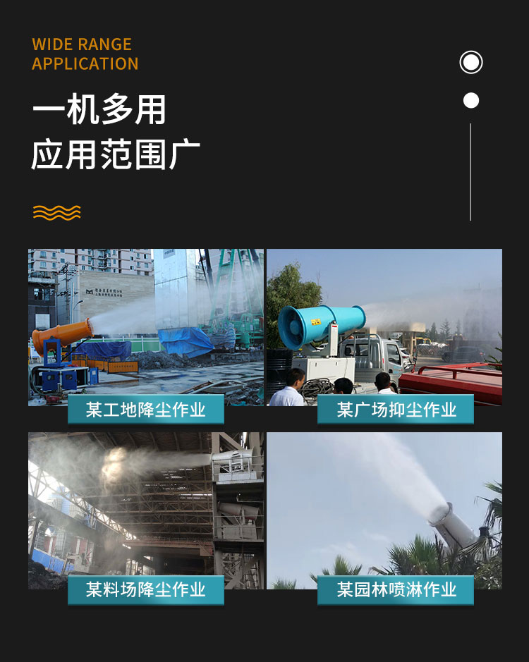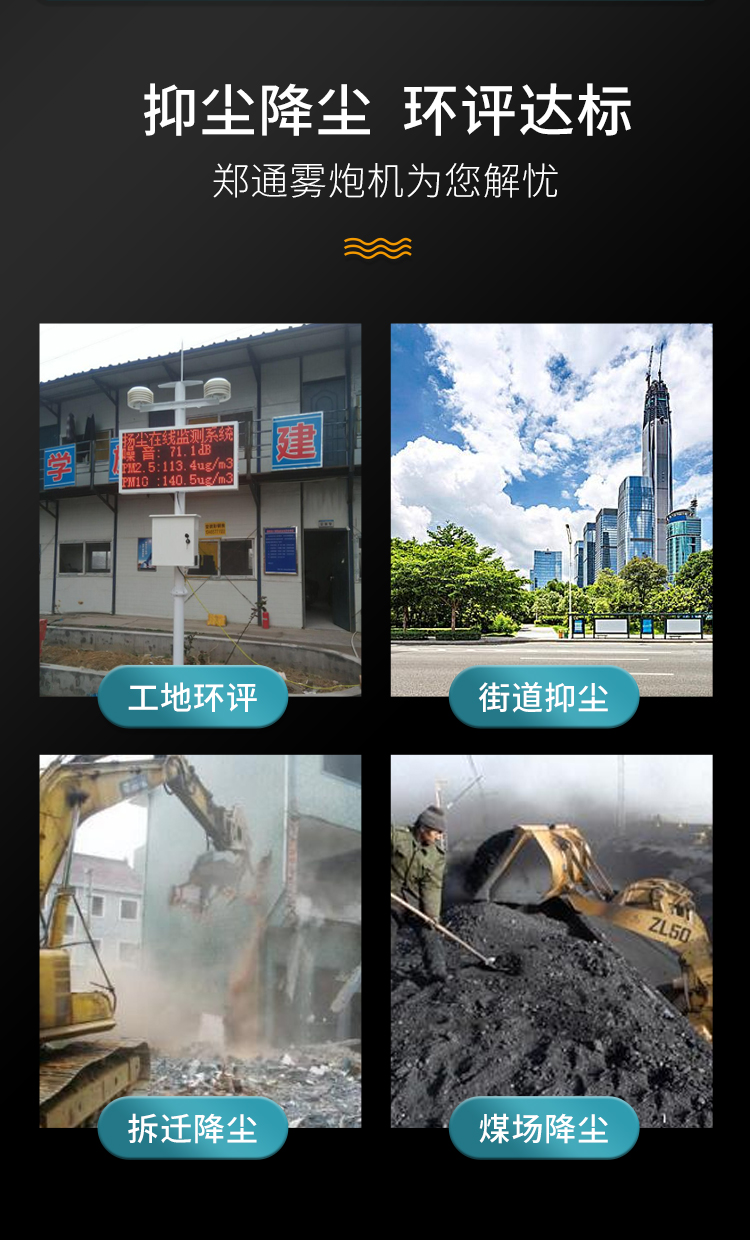 主要用途:用于城市拆遷工地、冶金鋼鐵企業、采礦區域、煤化工企業、水泥廠、火力發電廠、建筑工地、物料和礦產品露天堆放廠、混凝土處理廠、垃圾堆放場、垃圾焚燒廠、沙廠、干式物料倉庫、露天爆破、重度粉塵區域。
