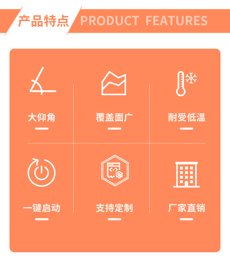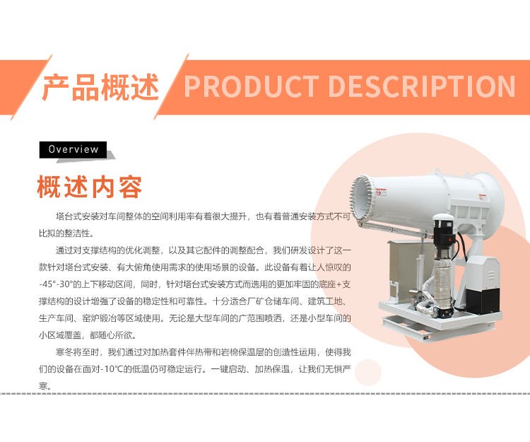 產品特點:塔臺式大仰角霧炮機有著讓人驚嘆的-45-30度的上下移動區(qū)間,同時,針對塔臺式安裝方式而確定的更加牢固的底座+支撐結構的設計增強了設備的穩(wěn)定性和可靠性。