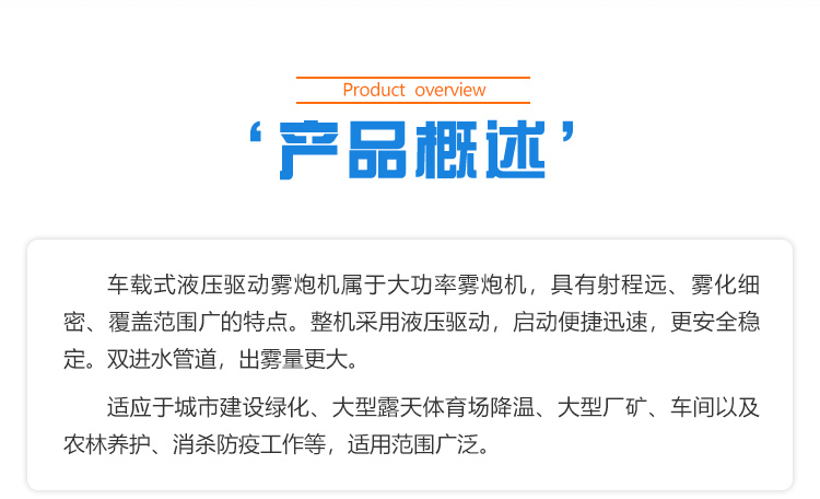 產品特點:車載液壓霧炮機屬于大型霧炮設計,具有風送距離遠、霧化覆蓋更廣泛的特點;整機采用液壓驅動,啟動便捷迅速,更安全穩定。