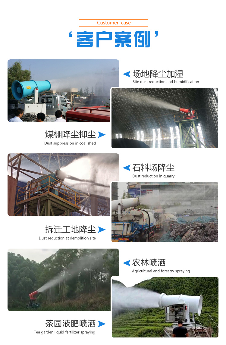 主要用途:用于煤礦場、城市拆遷工地、冶金鋼鐵企業、采礦區域、煤化工企業、水泥廠、火力發電廠、物料和礦產品露天堆放廠、混凝土處理廠、垃圾堆放場、垃圾焚燒廠、沙廠、干式物料倉庫、露天爆破、重度粉塵區域。