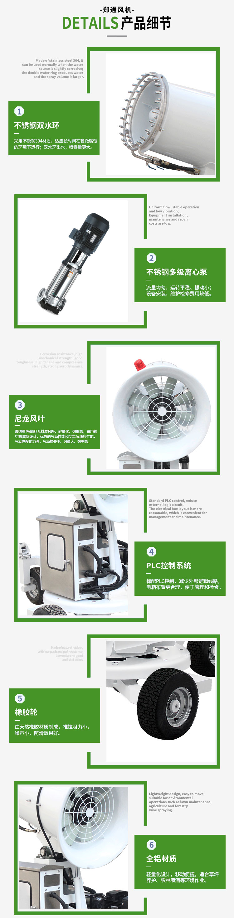 產品特點:草坪養(yǎng)護霧炮機使用輕量化全鋁材質機身,結構緊湊輕巧,大大降低了設備自重,再配合橡膠輪拖車架,移動迅速便捷,不易壓壞草坪、植被;采用不銹鋼多級離心泵與雙水環(huán)設計,霧量更大、覆蓋廣泛。