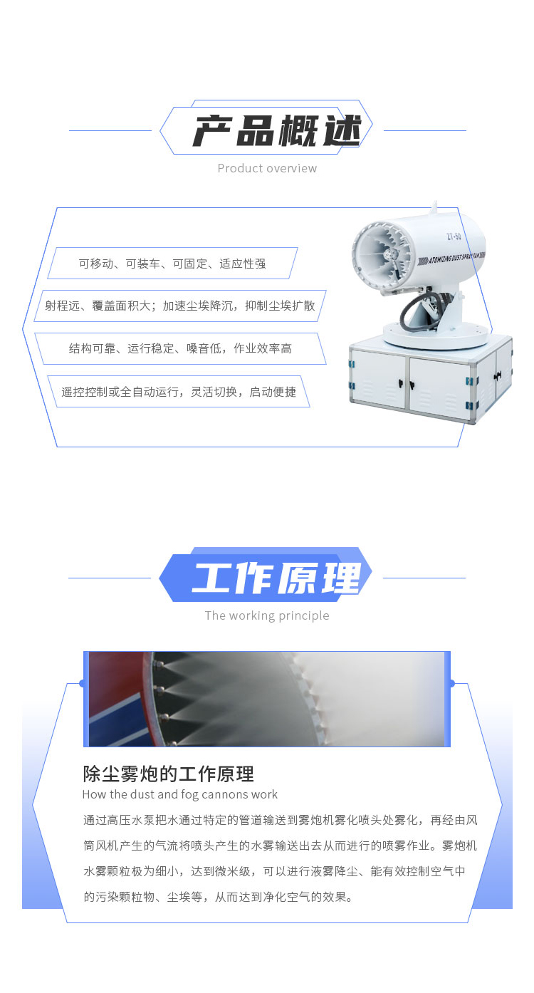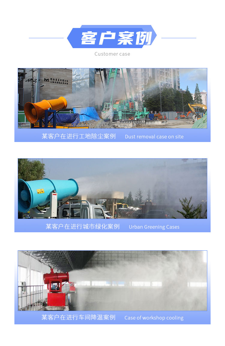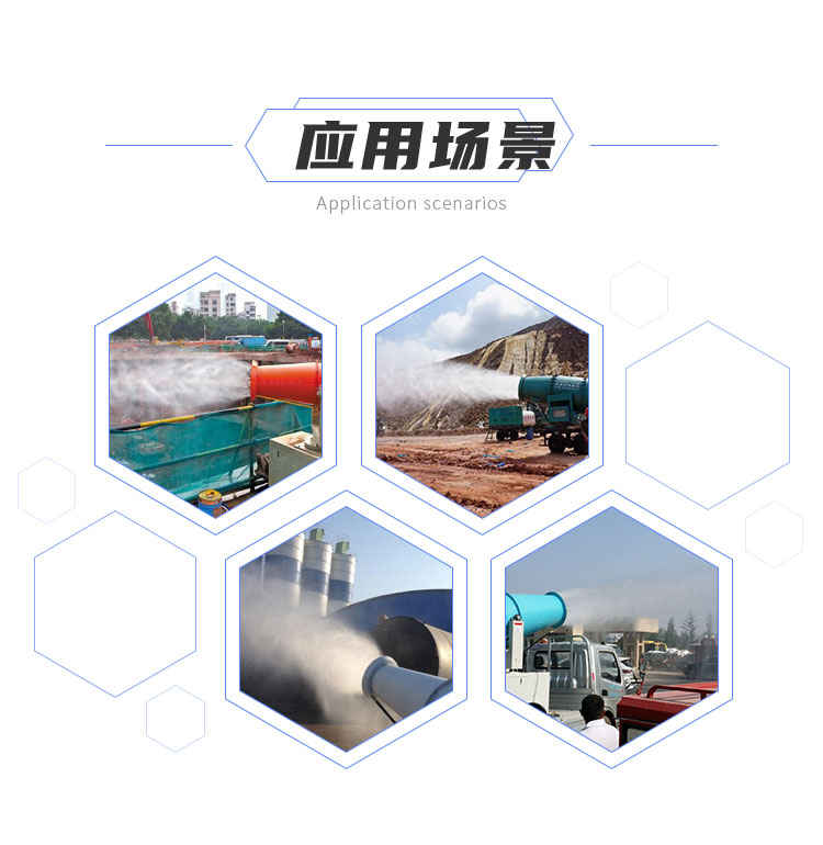 主要用途:用于煤礦場、城市拆遷工地、冶金鋼鐵企業、采礦區域、煤化工企業、水泥廠、火力發電廠、物料和礦產品露天堆放廠、混凝土處理廠、垃圾堆放場、垃圾焚燒廠、沙廠、干式物料倉庫、露天爆破、重度粉塵區域。