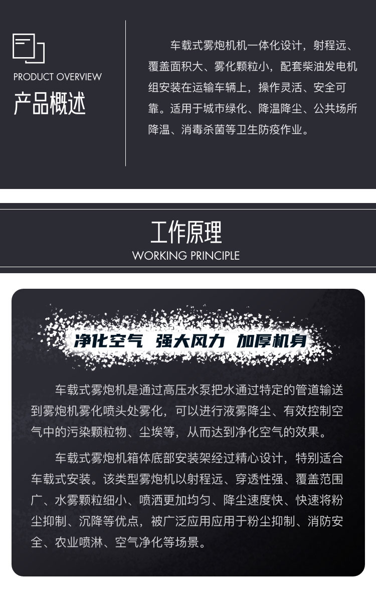 遠程車載霧炮機一體化設計,射程遠、覆蓋面積大、霧化顆粒小,配套柴油發電機組安裝在運輸車輛上,操作靈活、安全可靠。