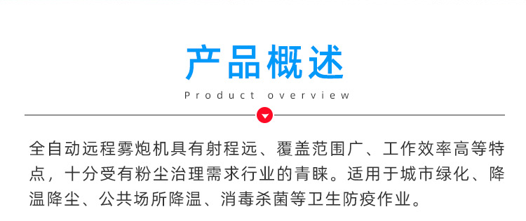 產品特點:全自動遠程霧炮機具有射程遠、覆蓋范圍廣、可以實現精量噴霧,霧化細密等特點。