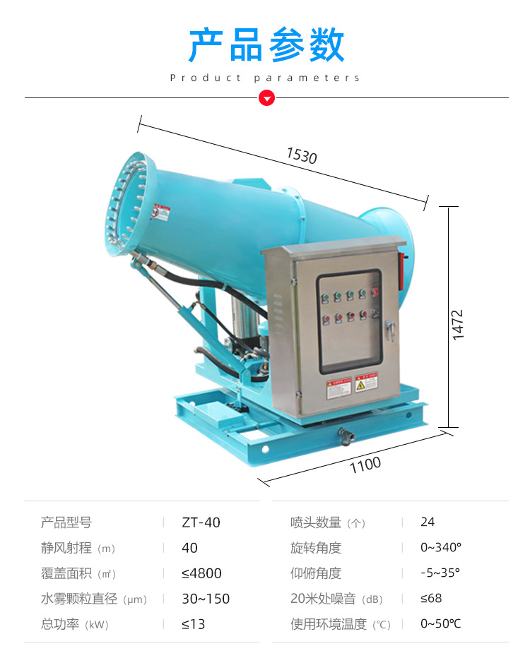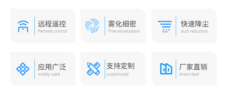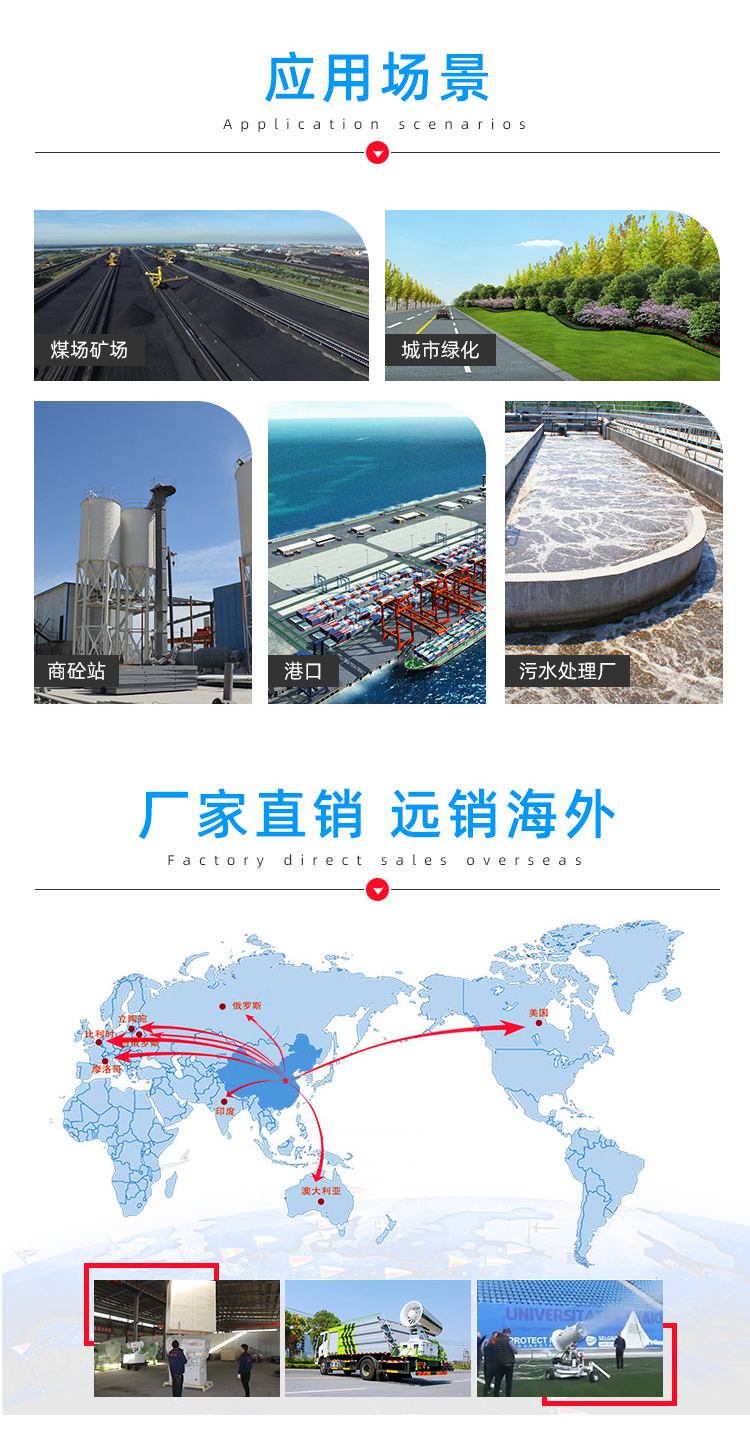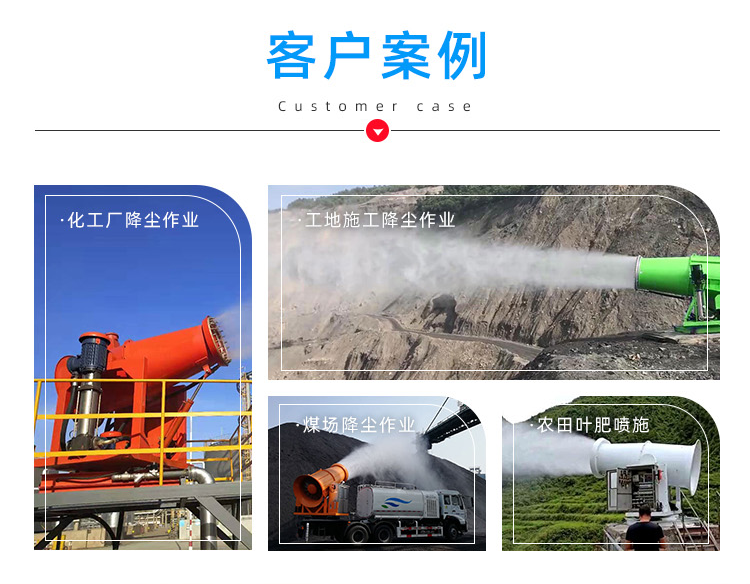 主要用途:用于煤礦場、城市拆遷工地、冶金鋼鐵企業、采礦區域、煤化工企業、水泥廠、火力發電廠、物料和礦產品露天堆放廠、混凝土處理廠、垃圾堆放場、垃圾焚燒廠、沙廠、干式物料倉庫、露天爆破、重度粉塵區域。