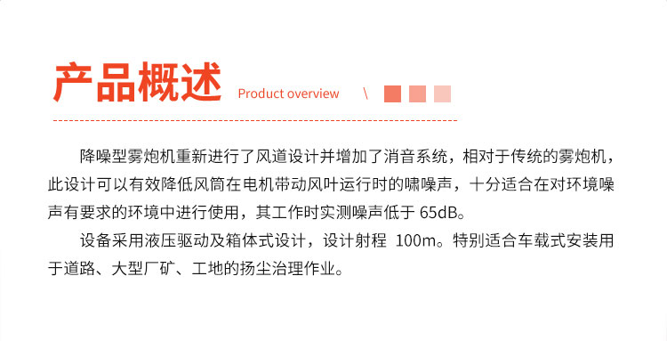 產(chǎn)品特點(diǎn):降噪型液壓霧炮機(jī)增加了消音系統(tǒng),相對(duì)于傳統(tǒng)的霧炮機(jī),此設(shè)計(jì)可以有效降低風(fēng)筒在電機(jī)帶動(dòng)風(fēng)葉運(yùn)行時(shí)的嘯噪聲,十分適合在對(duì)環(huán)境噪聲有要求的環(huán)境中進(jìn)行使用,其工作時(shí)實(shí)測(cè)噪聲低于65dB。
