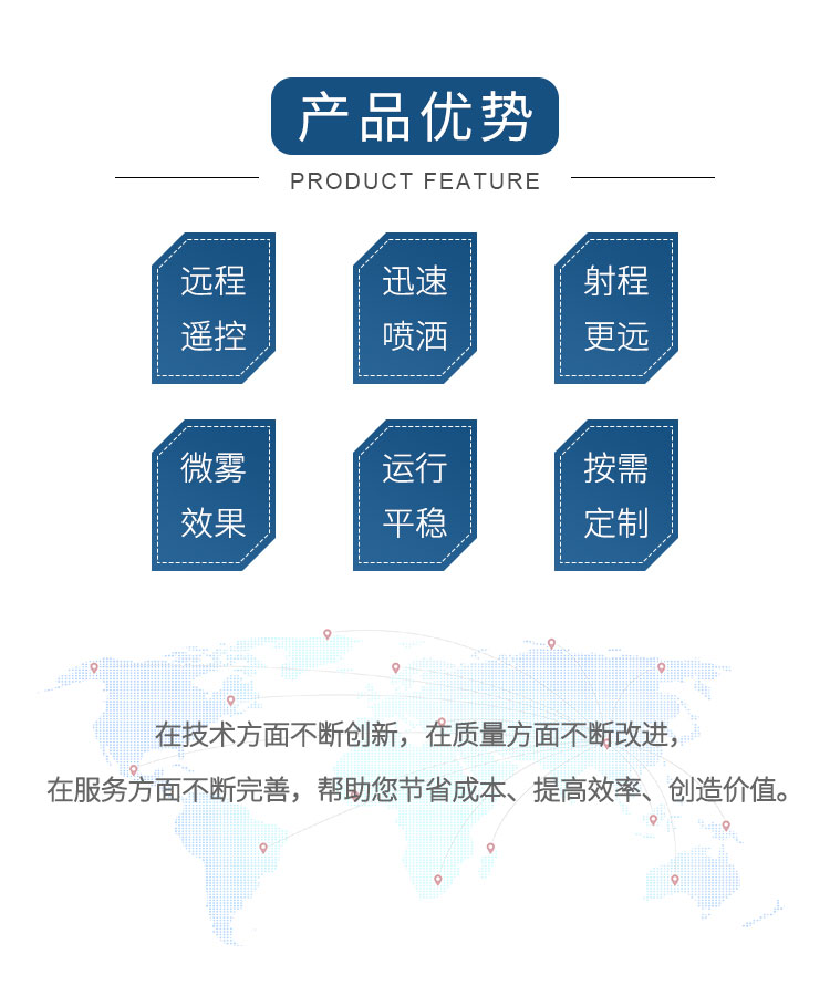 產(chǎn)品特點(diǎn):固定式遠(yuǎn)程霧炮機(jī)射程遠(yuǎn)、覆蓋范圍廣、工作效率高、可以實(shí)現(xiàn)精量噴霧;配套動力靈活,使用安全可靠。
