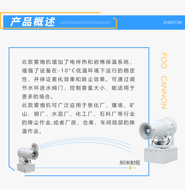 產品特點:車載式遠程霧炮機通過對電加熱伴熱帶和巖棉保沿層的運用,在-10°℃的低溫環(huán)境中仍然可以穩(wěn)定運行井保證工作效率。