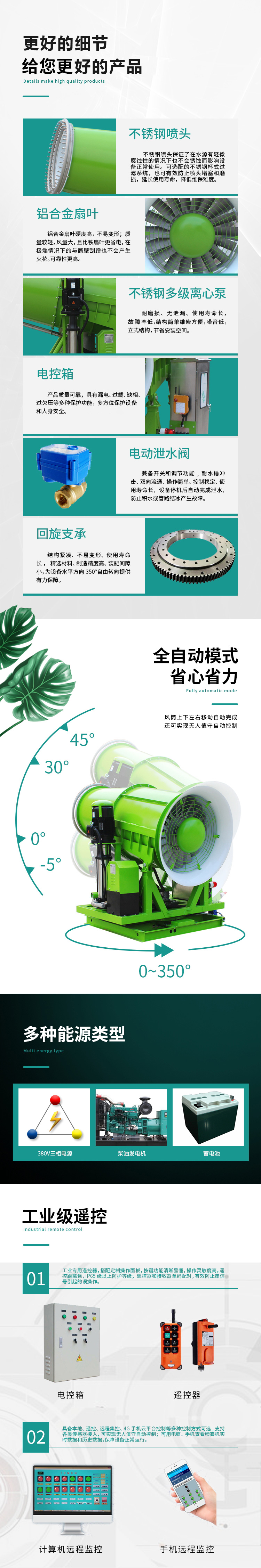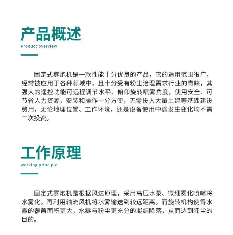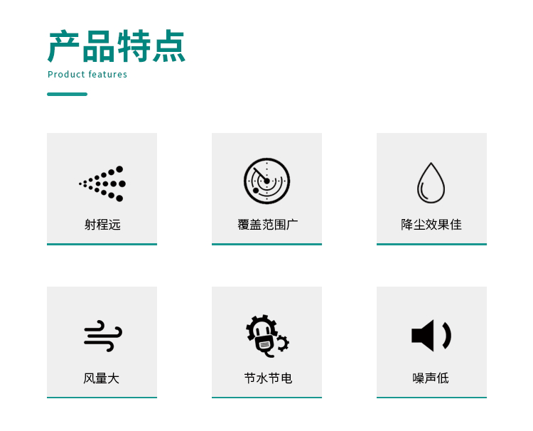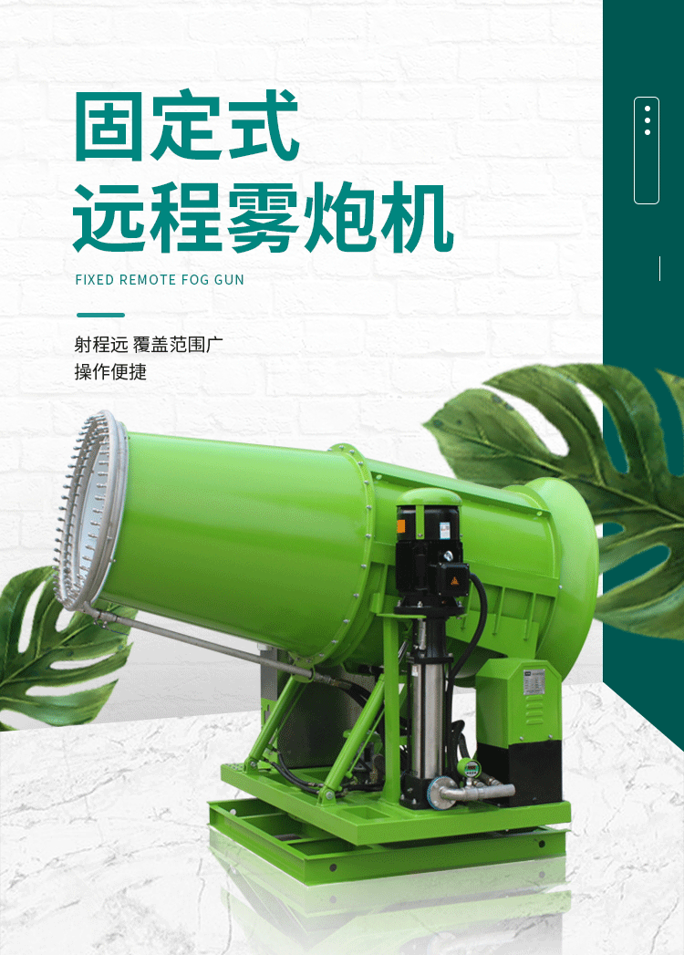 產品特點:固定式遠程料場霧炮機射程遠、覆蓋范圍廣、工作效率高、可以實現精量噴霧;噴出的霧粒細小,能快速將粉塵抑制;配套動力靈活,使用安全可靠。