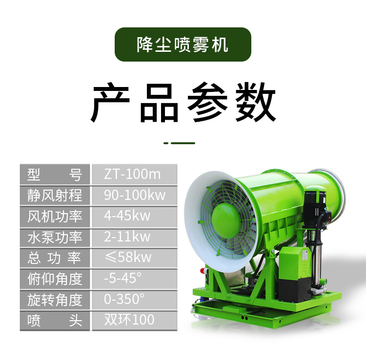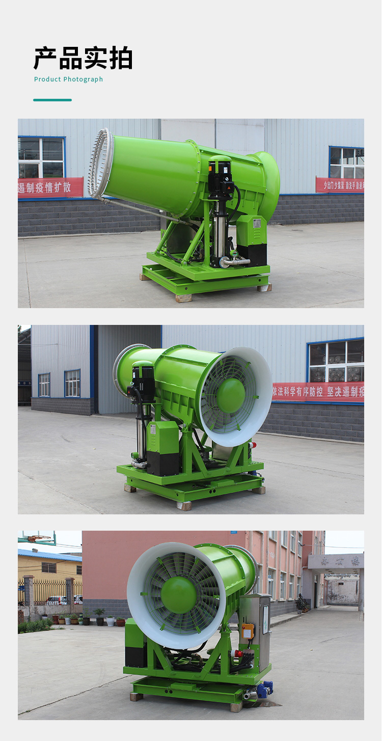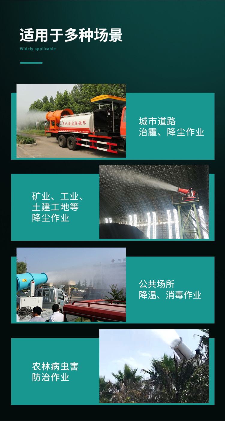 主要用途:用于煤礦場、城市拆遷工地、冶金鋼鐵企業、采礦區域、煤化工企業、水泥廠、火力發電廠、物料和礦產品露天堆放廠、混凝土處理廠、垃圾堆放場、垃圾焚燒廠、沙廠、干式物料倉庫、露天爆破、重度粉塵區域。