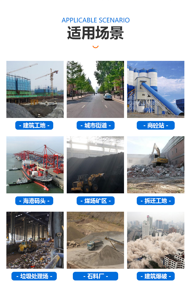 主要用途:用于煤礦場地、冶金鋼鐵企業、采礦區域、煤化工企業、水泥廠、火力發電廠、建筑工地、物料和礦產品露天堆放廠、混凝土處理廠、垃圾堆放場、垃圾焚燒廠、沙廠、干式物料倉庫、露天爆破、重度粉塵區域。