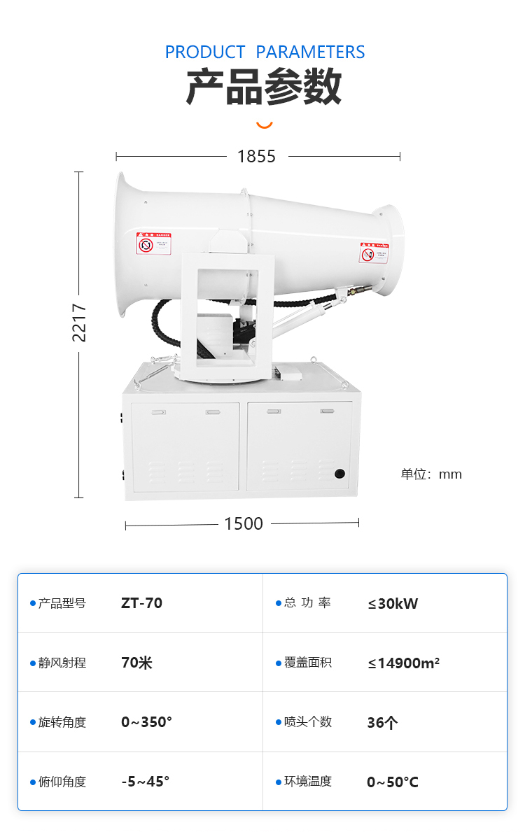 產品特點:70米煤場降塵霧炮機采用內嵌疏流設計箱,可提高射程,精鋁風葉,加厚材質,風葉黃金比例疏流,工作效率高,故障率低。