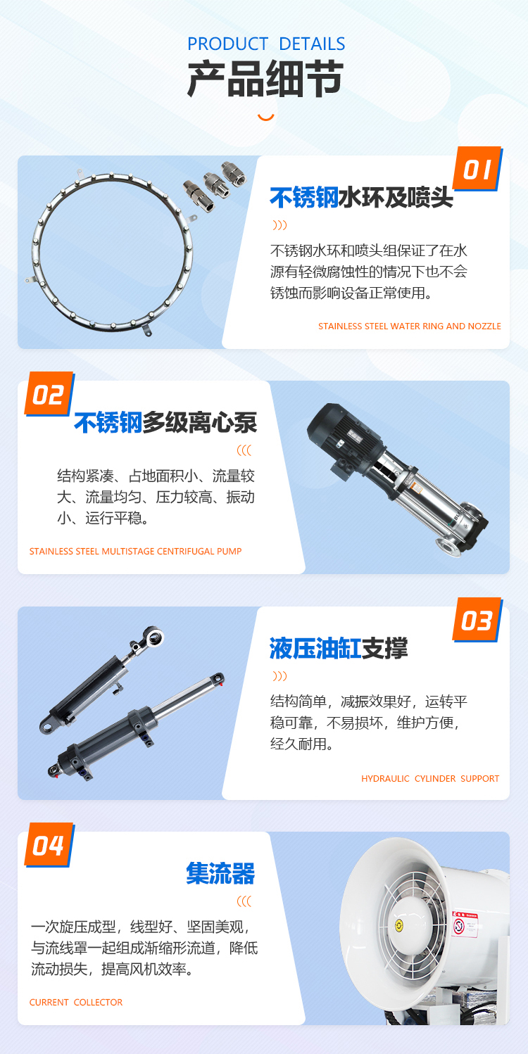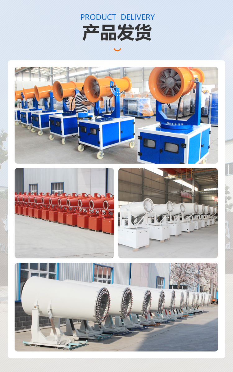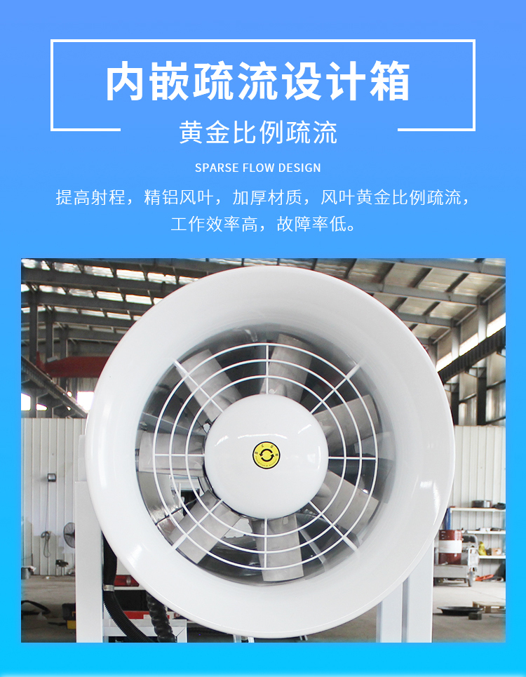 產品特點:化工廠降塵霧炮機采用內嵌疏流設計箱,可提高射程,精鋁風葉,加厚材質,風葉黃金比例疏流,工作效率高,故障率低。