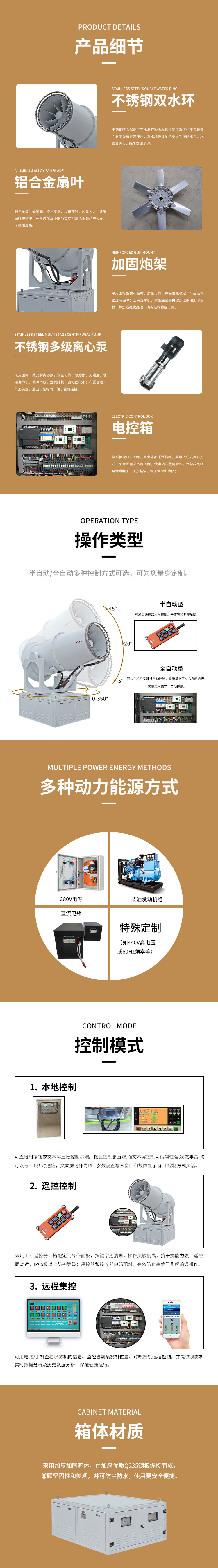 產品特點:大型除塵噴霧炮噴霧距離遠、覆蓋范圍廣、霧化顆粒細、降塵效果佳、運行平穩使用安全可靠。