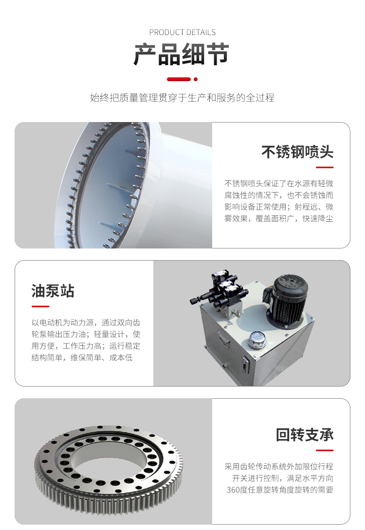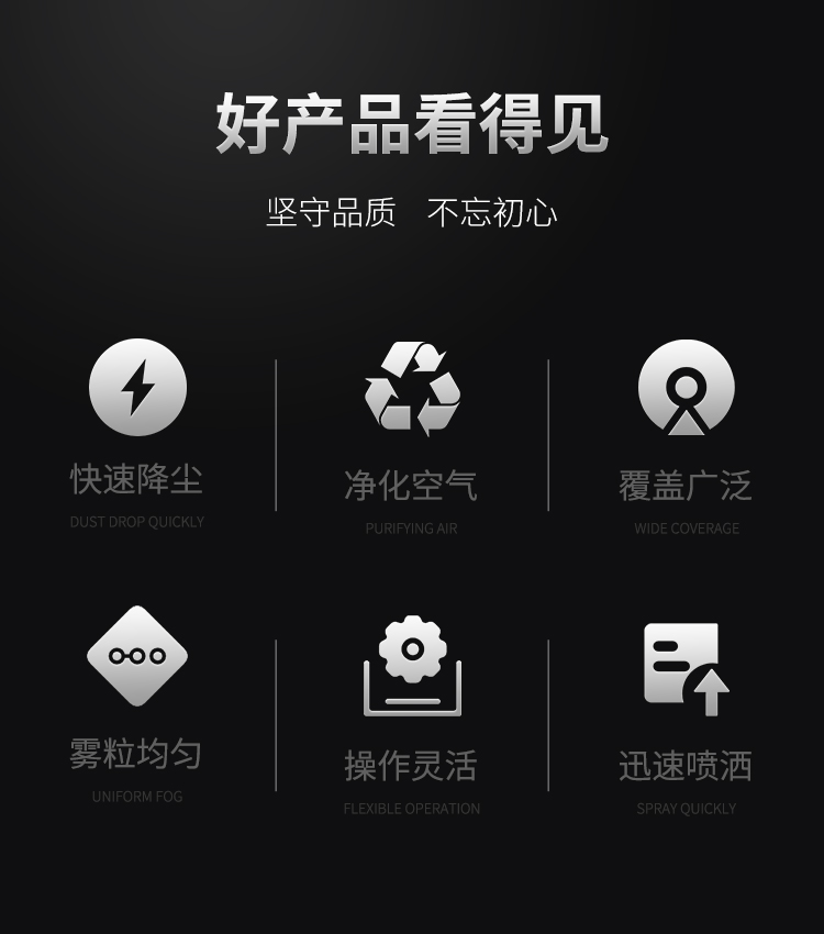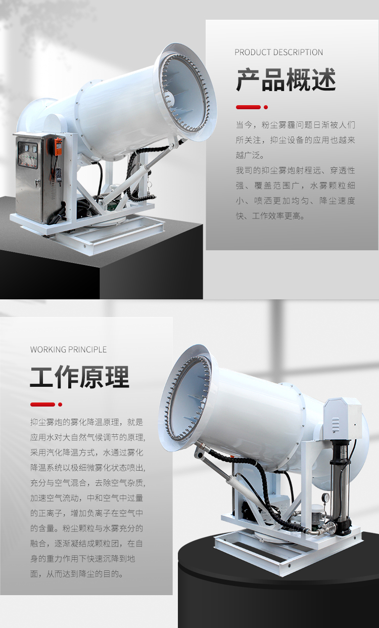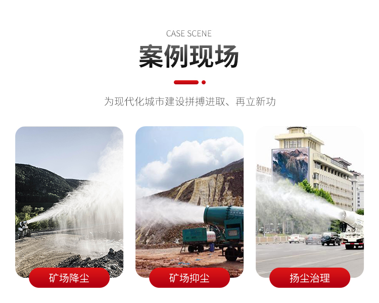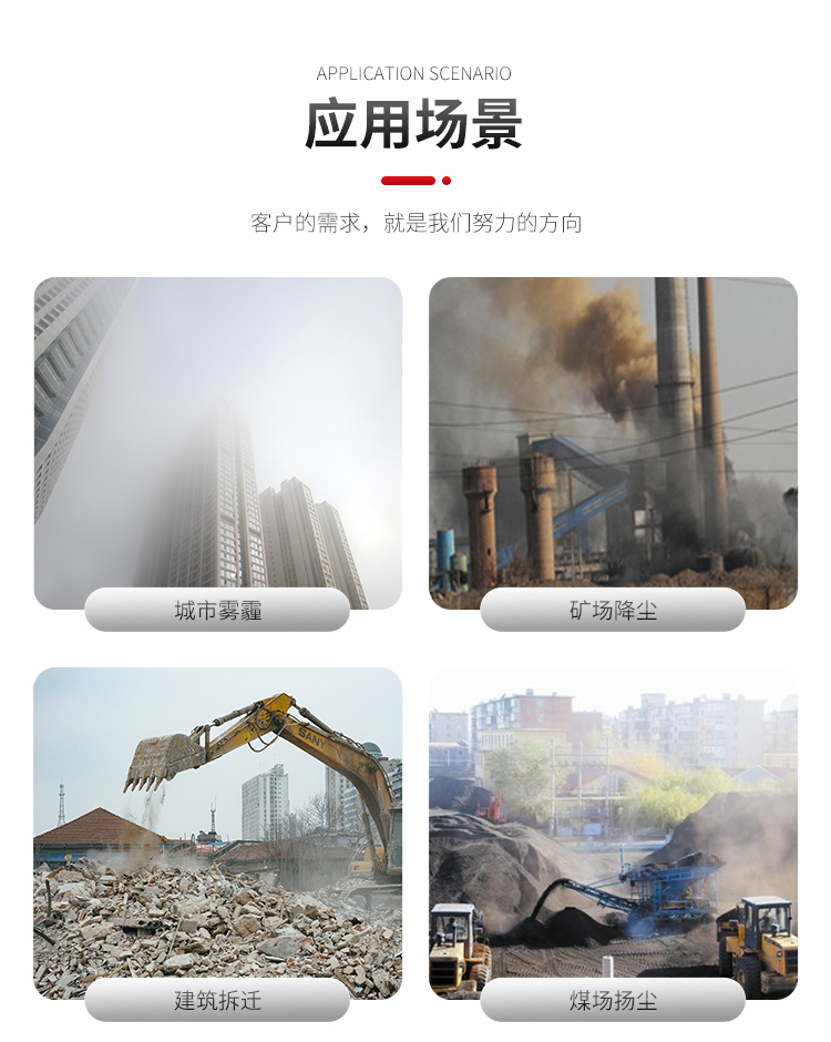 主要用途:用于城市拆遷工地、冶金鋼鐵企業(yè)、采礦區(qū)域、煤化工企業(yè)、水泥廠、火力發(fā)電廠、建筑工地、物料和礦產(chǎn)品露天堆放廠、混凝土處理廠、垃圾堆放場(chǎng)、垃圾焚燒廠、沙廠、干式物料倉(cāng)庫(kù)、露天爆破、重度粉塵區(qū)域。