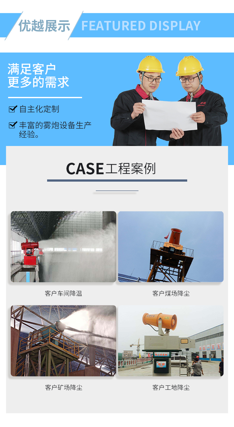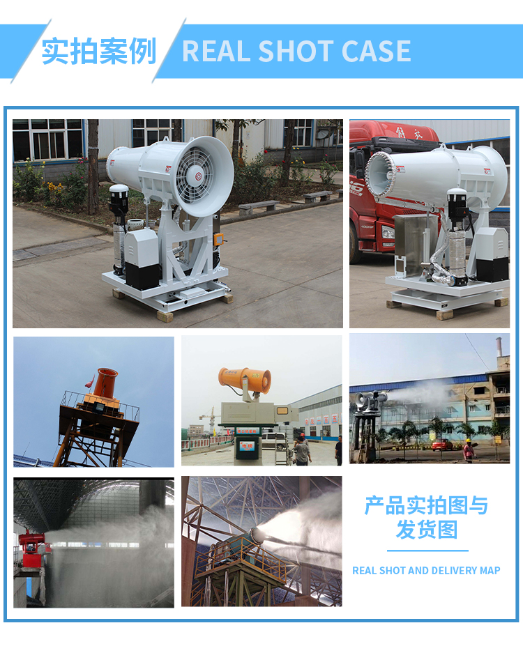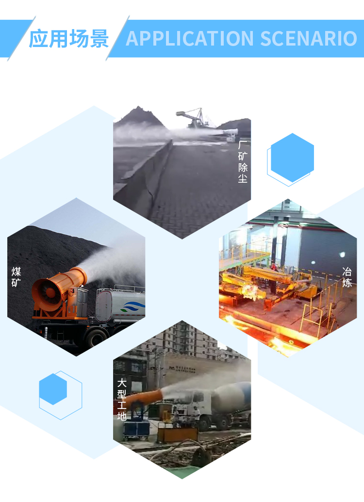 主要用途:適用于城市拆遷工地、冶金鋼鐵企業、采礦區域、煤化工企業、水泥廠、火力發電廠、建筑工地、物料和礦產品露天堆放廠、混凝土處理廠、垃圾堆放場、垃圾焚燒廠、沙廠、干式物料倉庫、露天爆破、重度粉塵區域。