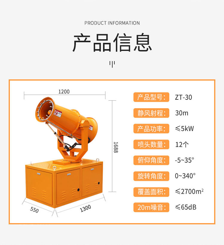 主要用途:建筑工地 煤場,工業(yè)除塵,農(nóng)業(yè),園林綠化等飛機場、高速公路、車站、碼頭、公共場所、運動場地、炎熱場地等降塵保濕降溫消毒。