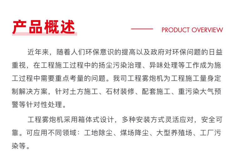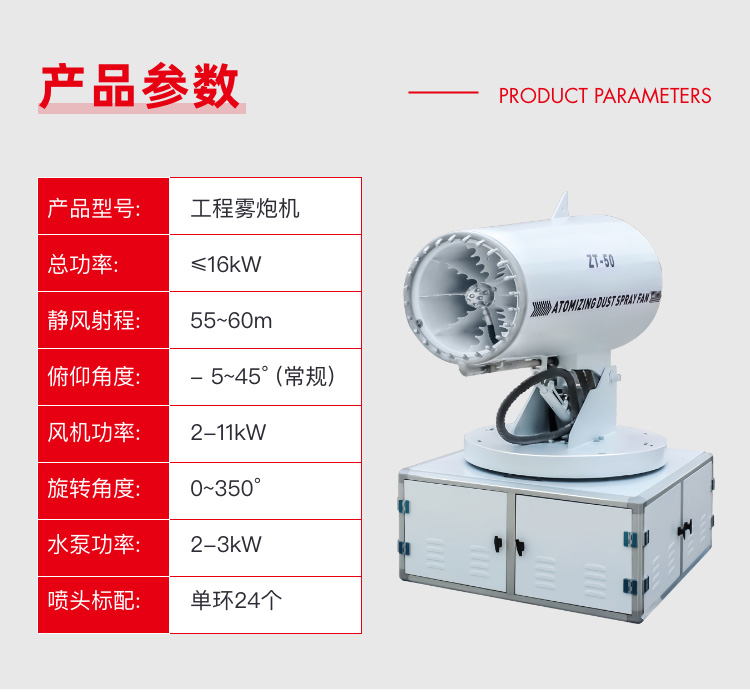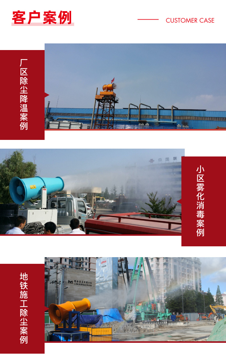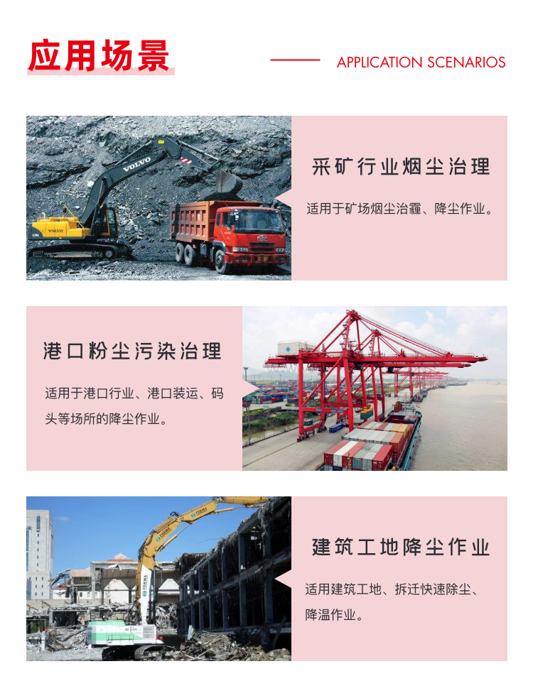 主要用途:適用于城市拆遷工地、冶金鋼鐵企業(yè)、采礦區(qū)域、煤化工企業(yè)、水泥廠、火力發(fā)電廠、建筑工地、物料和礦產品露天堆放廠、混凝土處理廠、垃圾堆放場、垃圾焚燒廠、沙廠、干式物料倉庫、露天爆破、重度粉塵區(qū)域。