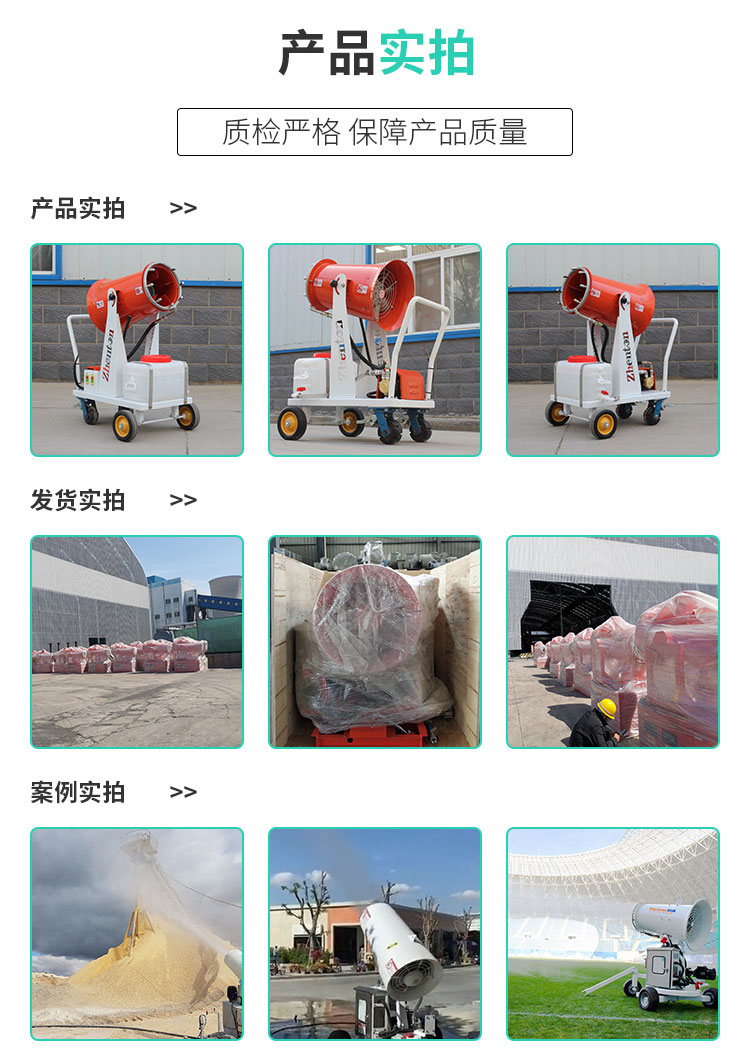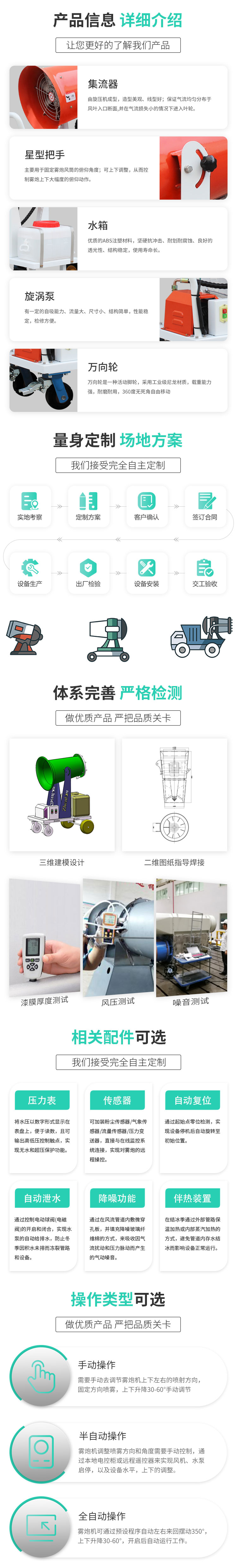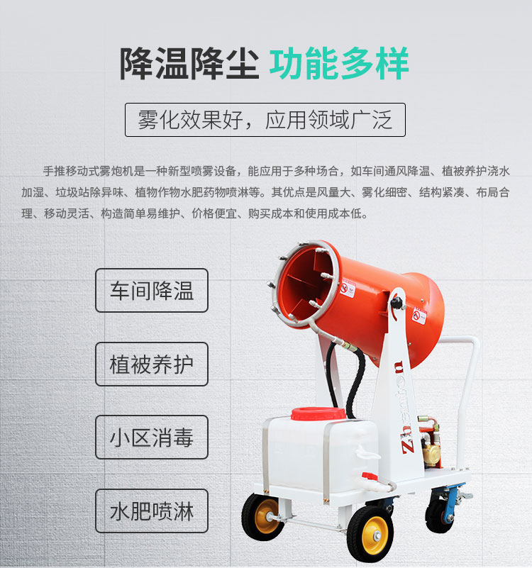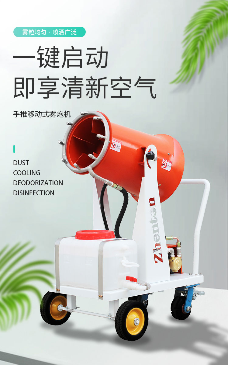 產(chǎn)品特點:工地小型手推移動式霧炮機降塵速度快、風量大、機結構緊湊、布局合理、移動靈活、構造簡單易維護。
