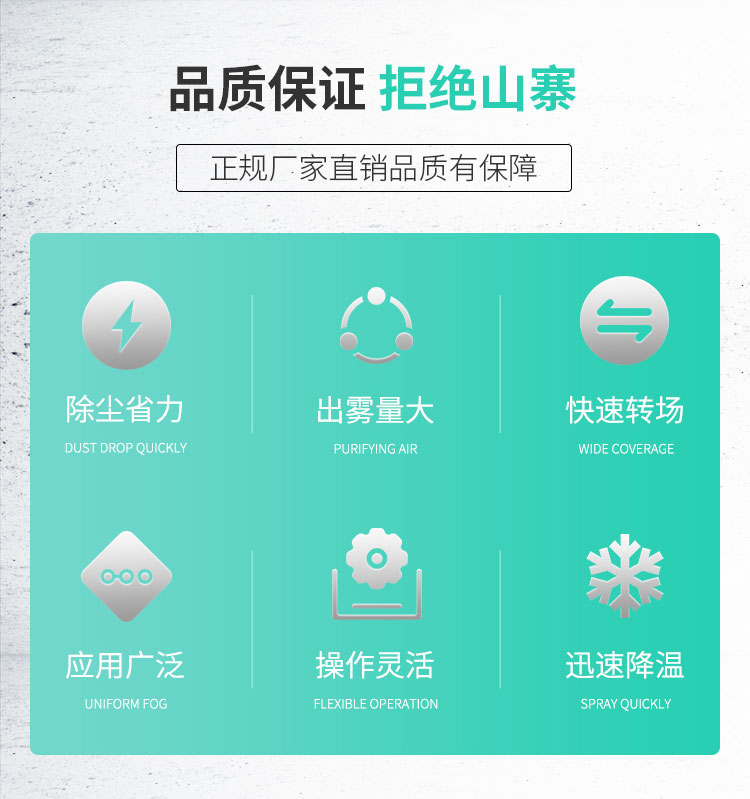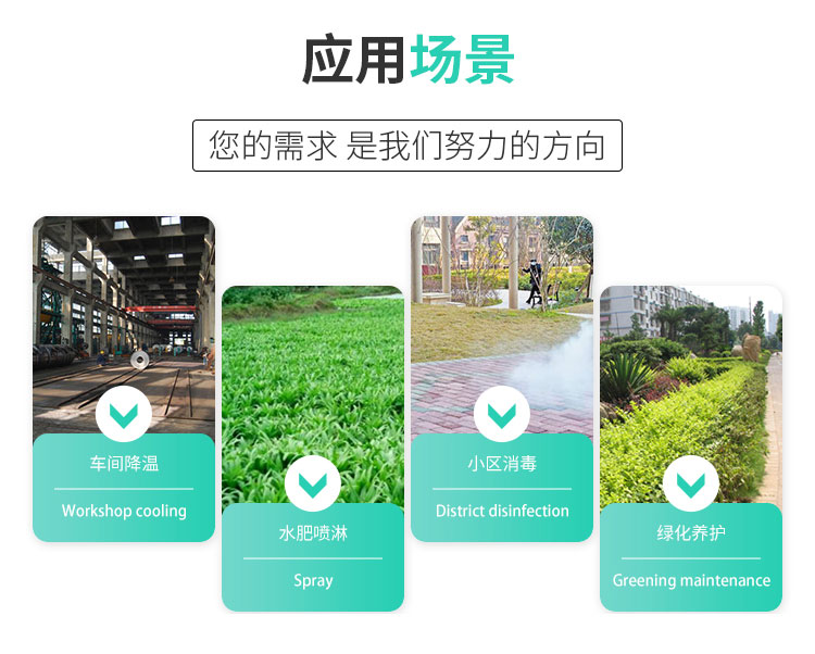主要用途:車間通風降溫、植被養(yǎng)護澆水加濕、垃圾站除異味、植物作物水肥藥物噴淋等。