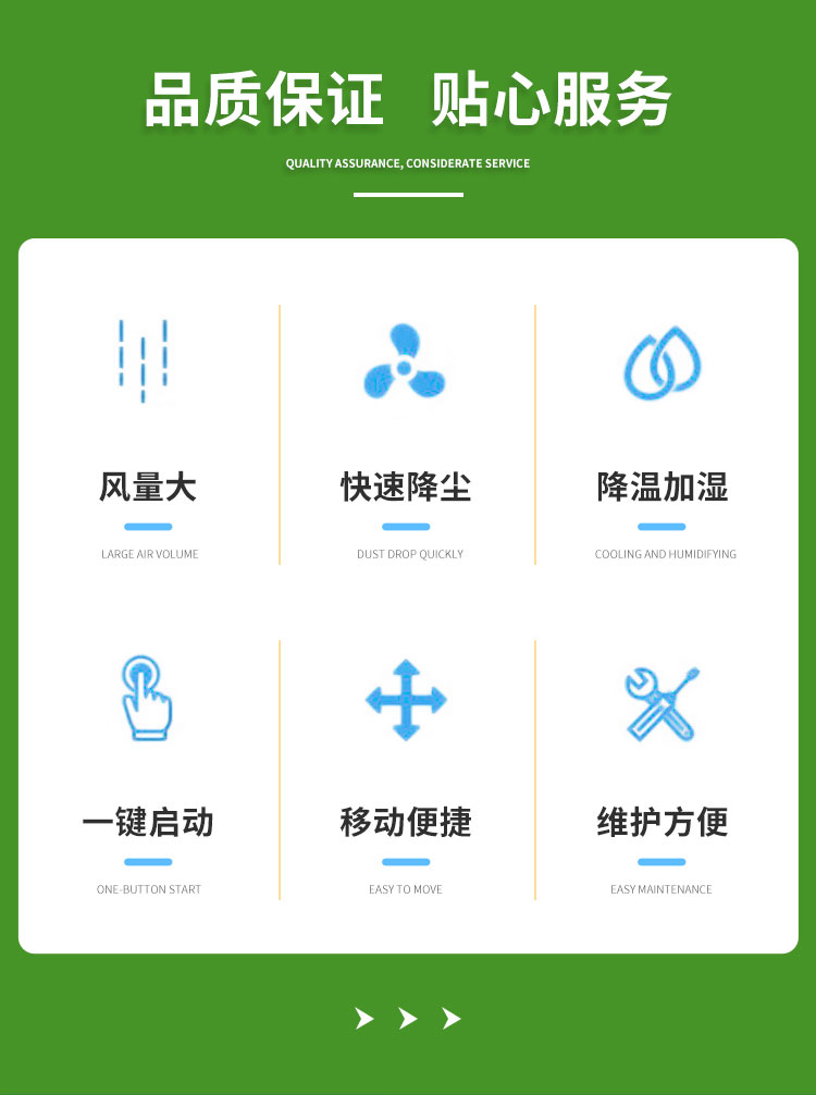 產(chǎn)品特點:30米移動式噴霧風(fēng)機(jī)這款產(chǎn)品具有一鍵啟動功能,能起到快速降塵、降溫的作用;移動便捷,方便維修。