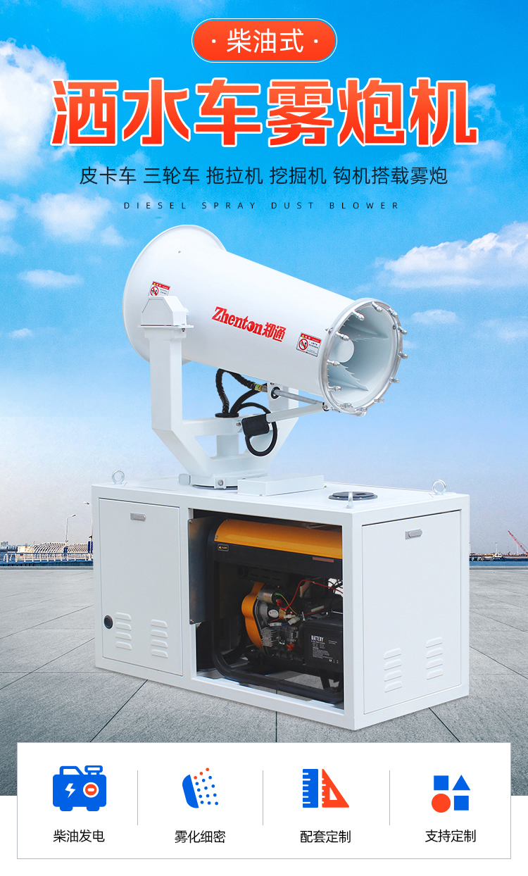灑水車配套霧炮機,發電機發電、智能全自動、遙控、性能穩定、堅固耐用、故障率低。