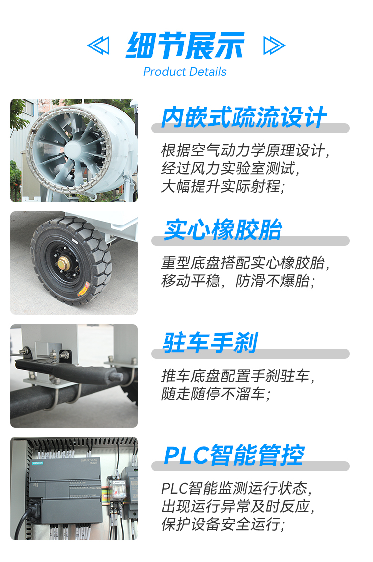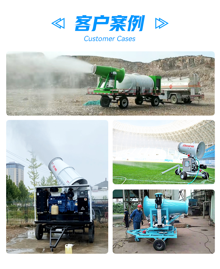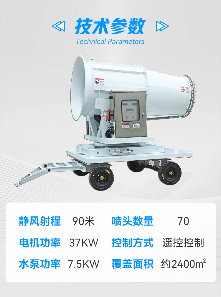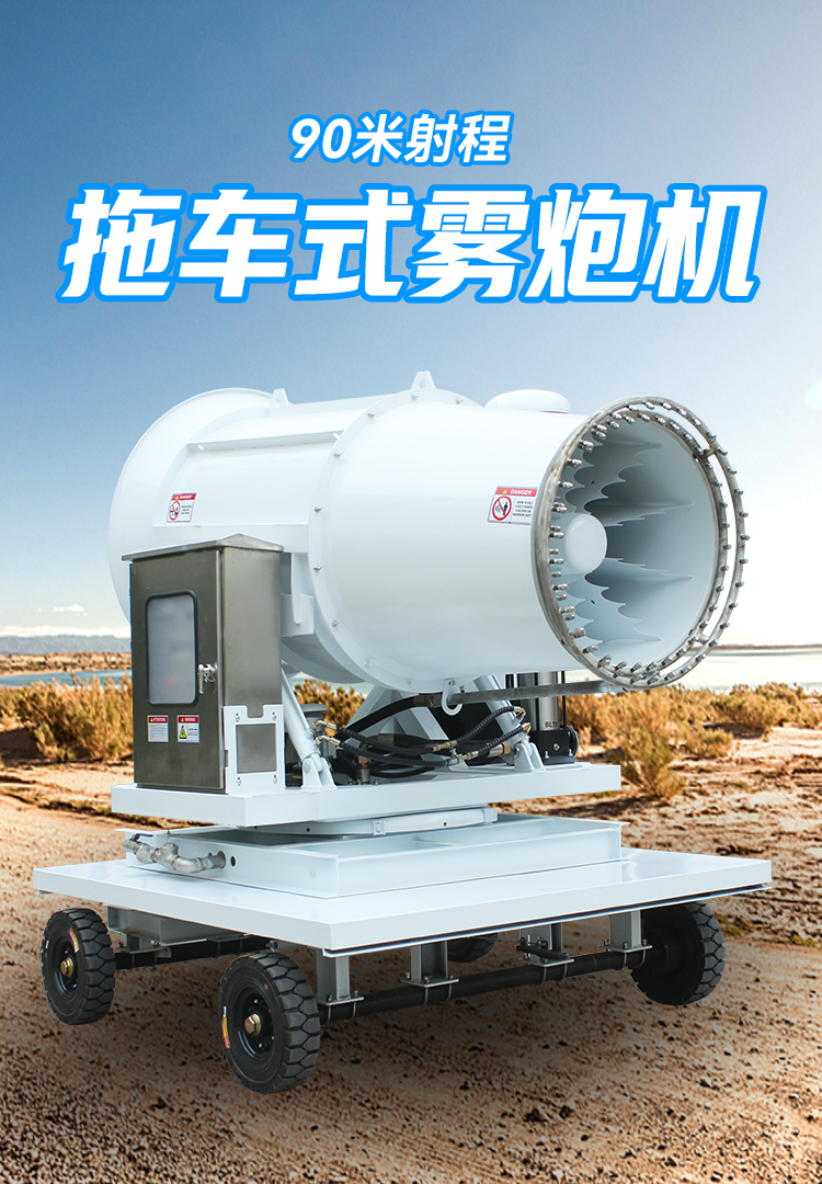 產(chǎn)品特點(diǎn):90米拖車式霧炮機(jī)采用四輪牽引設(shè)計(jì),移動性強(qiáng)、動力強(qiáng)、射程遠(yuǎn)、覆蓋廣泛、可實(shí)現(xiàn)精量噴霧;工作效能高、噴霧加濕更快,能迅速降溫抑塵;配件驅(qū)動可靈活定制,操作便捷,靈活方便。