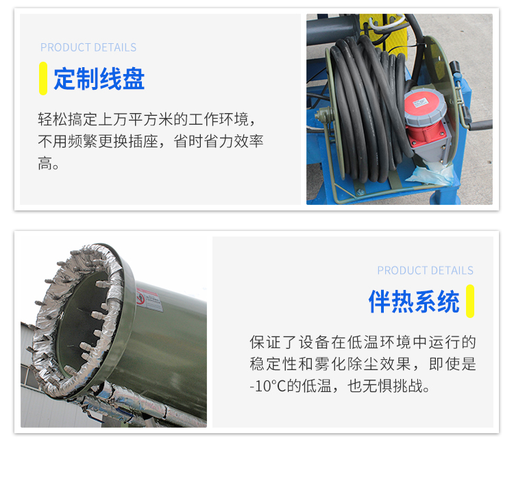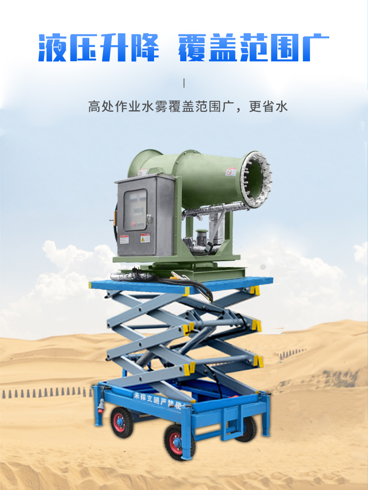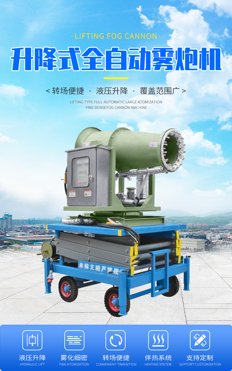 產品特點:這款40米升降式霧炮機,采用拖車式設計,方便移動,轉場靈活,全自動操作方式,液壓升降,可實現高處噴霧降塵,覆蓋范圍更廣。除此之外,這款霧炮機還加有伴熱保溫系統,零度環境也能正常穩定運行。