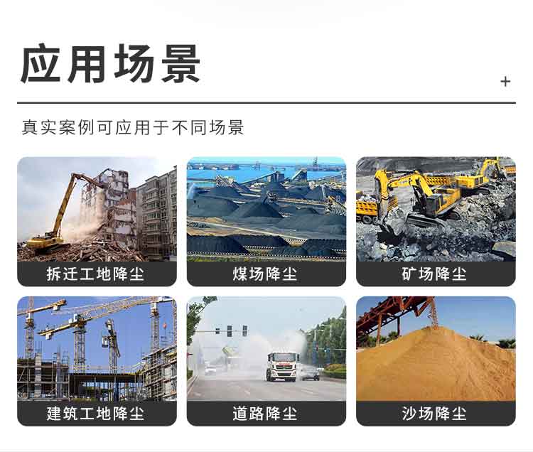 主要用途:冶金鋼鐵企業(yè)、采礦區(qū)域、煤化工企業(yè)、水泥廠、火力發(fā)電廠、城市拆遷工地、建筑工地、露天堆放廠、混凝土處理廠、垃圾堆放場(chǎng)、垃圾焚燒廠、城市道路降塵、噴霧打藥等場(chǎng)景。