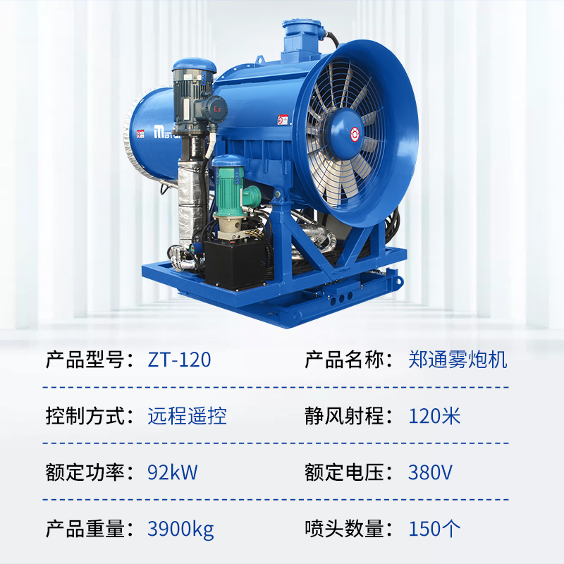 產品特點:這款是鄭通生產的120米射程的防爆型霧炮機,整體均采用防爆材質,能在易燃易爆環境中安全運行;射程遠、覆蓋范圍廣,可有效降塵;霧化效果好,能精準控制霧滴大小;具備良好的機動性,可遠程遙控操作,100米遙控距離,操作簡便。