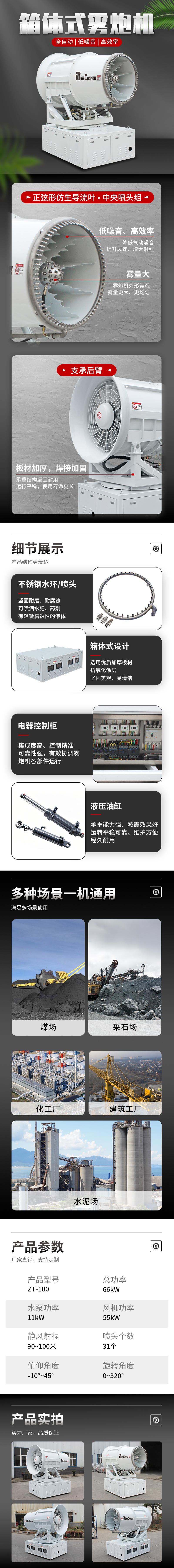 產(chǎn)品特點:ZT-100型車載箱體式霧炮機(jī)是鄭州鄭通風(fēng)機(jī)制造有限公司生產(chǎn)的一款能裝配灑水車使用的霧炮機(jī),箱體式設(shè)計,加厚板材,噪音低,全自動遠(yuǎn)程操作,操作便捷,多場景一機(jī)通用,100米射程,總功率66kw,可實現(xiàn)上下左右旋轉(zhuǎn)噴霧。