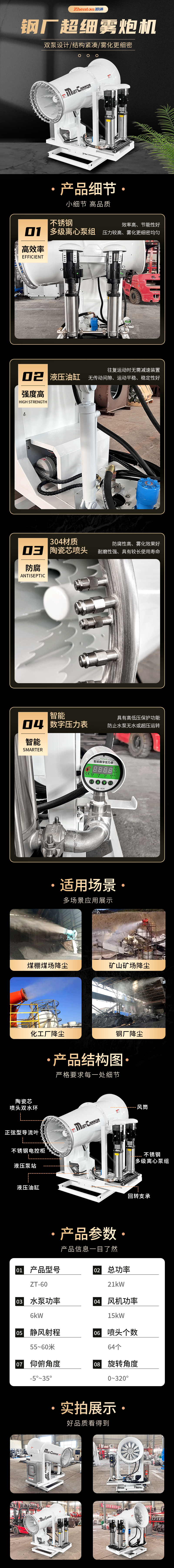 產(chǎn)品特點(diǎn):這款ZT-60型鋼廠超細(xì)霧炮機(jī),實(shí)際射程在50-60米,雙泵設(shè)計(jì),結(jié)構(gòu)緊湊,霧化更細(xì)密,是鋼廠,煤場(chǎng),水泥廠,電廠,煤棚等要求環(huán)保達(dá)標(biāo)的場(chǎng)景必備噴霧降塵設(shè)備。用的是不銹鋼多級(jí)離心泵組,效率高的同時(shí)也更節(jié)能,液壓油缸,穩(wěn)定性強(qiáng)。304陶瓷噴頭,防腐性高,使用壽命更長(zhǎng)。配備有智能數(shù)字壓力表。具有高低壓保護(hù)功能,防止水泵無水或超壓運(yùn)轉(zhuǎn)。鄭通霧炮機(jī)廠家生產(chǎn),好質(zhì)量看的到,15-150型,款式齊全,定制可選。