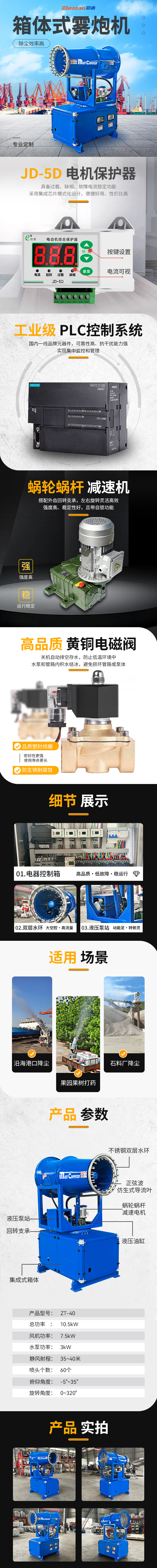 產(chǎn)品特點:這款ZT-40型霧炮機(jī),箱體式設(shè)計,結(jié)構(gòu)緊湊,除塵效率高,占地面積也小。整體配置有JD-5D電機(jī)保護(hù)器,具有過載,缺相,故障電流鎖定功能,采用集成芯片模式化設(shè)計,便捷好用,性價比高。工業(yè)級PL智能控制系統(tǒng),國內(nèi)一線品牌元器件、可靠性強(qiáng)抗干擾能力強(qiáng),可以實現(xiàn)集中監(jiān)控和管理。蝸輪蝸桿減速電機(jī)搭配外齒回轉(zhuǎn)支撐,左右噴霧角度可實現(xiàn)0~320°,俯仰角度-5~35°,旋轉(zhuǎn)角度靈活,降塵更高效。15-150米射程,型號齊全,可根據(jù)您的現(xiàn)場情況定制霧炮機(jī)。 有需要歡迎隨時聯(lián)系:徐經(jīng)理17303712093(微信同號)