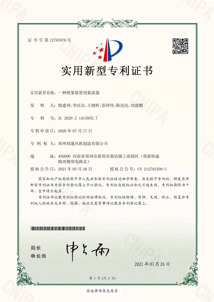 一種噴霧裝置用集流器實(shí)用新型專利證書(shū)